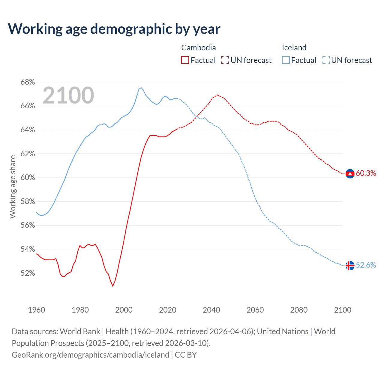 - Cambodia has 11.6M working age adults (aged 15-64) vs 264K in Iceland.