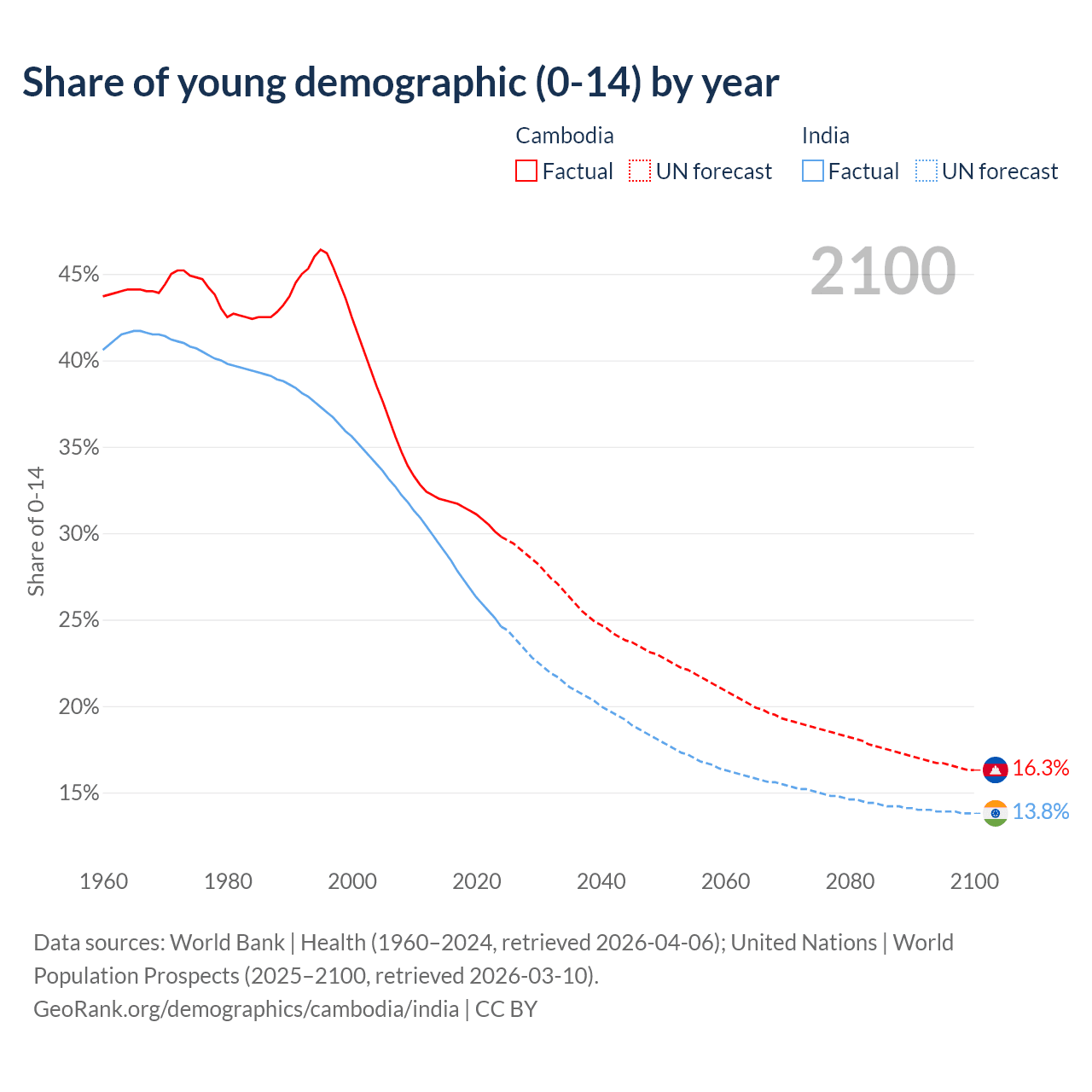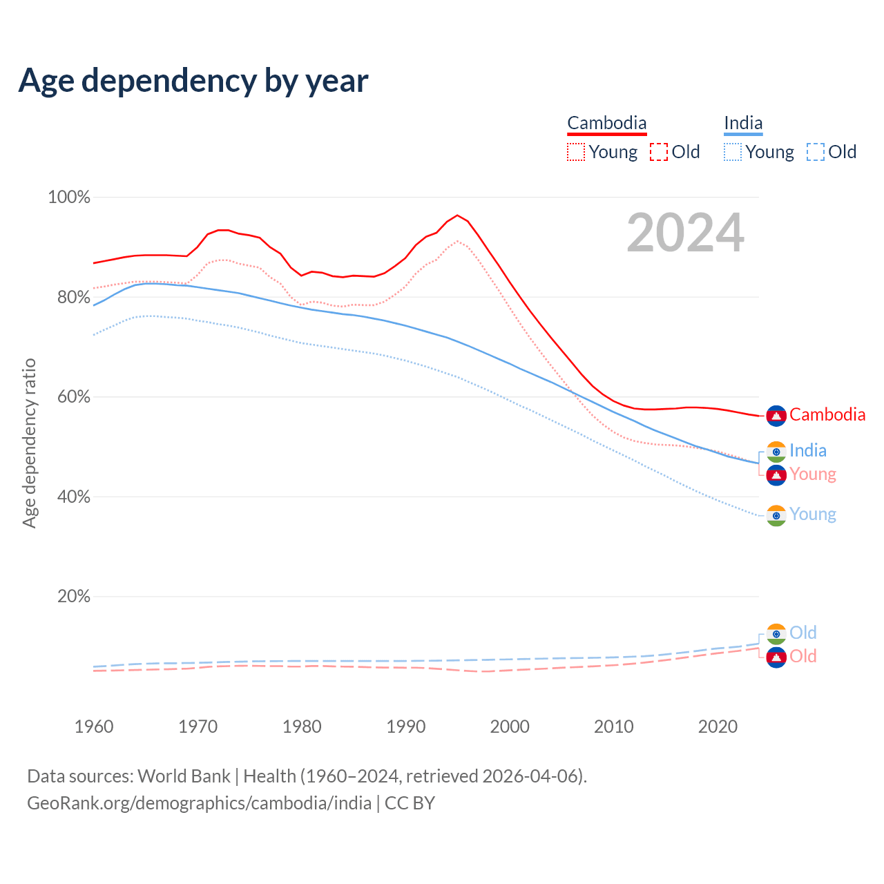 - Cambodia is ranked 121/196 by median age (oldest to youngest) vs 108/196 for India.