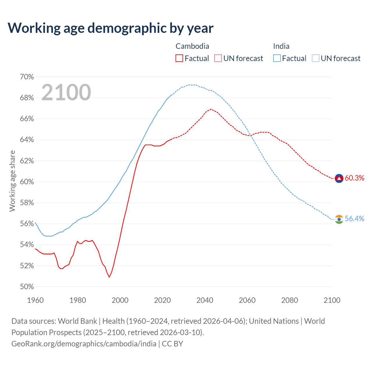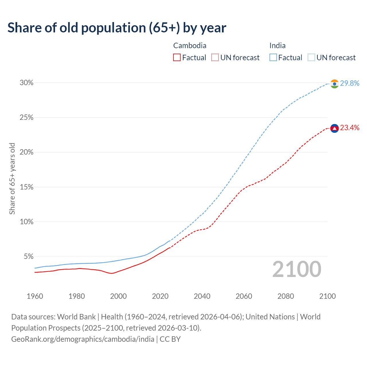 The share of older people aged 65 and over is 6.16% in Cambodia and 7.15% in India. Life expectancy in Cambodia compared to India .