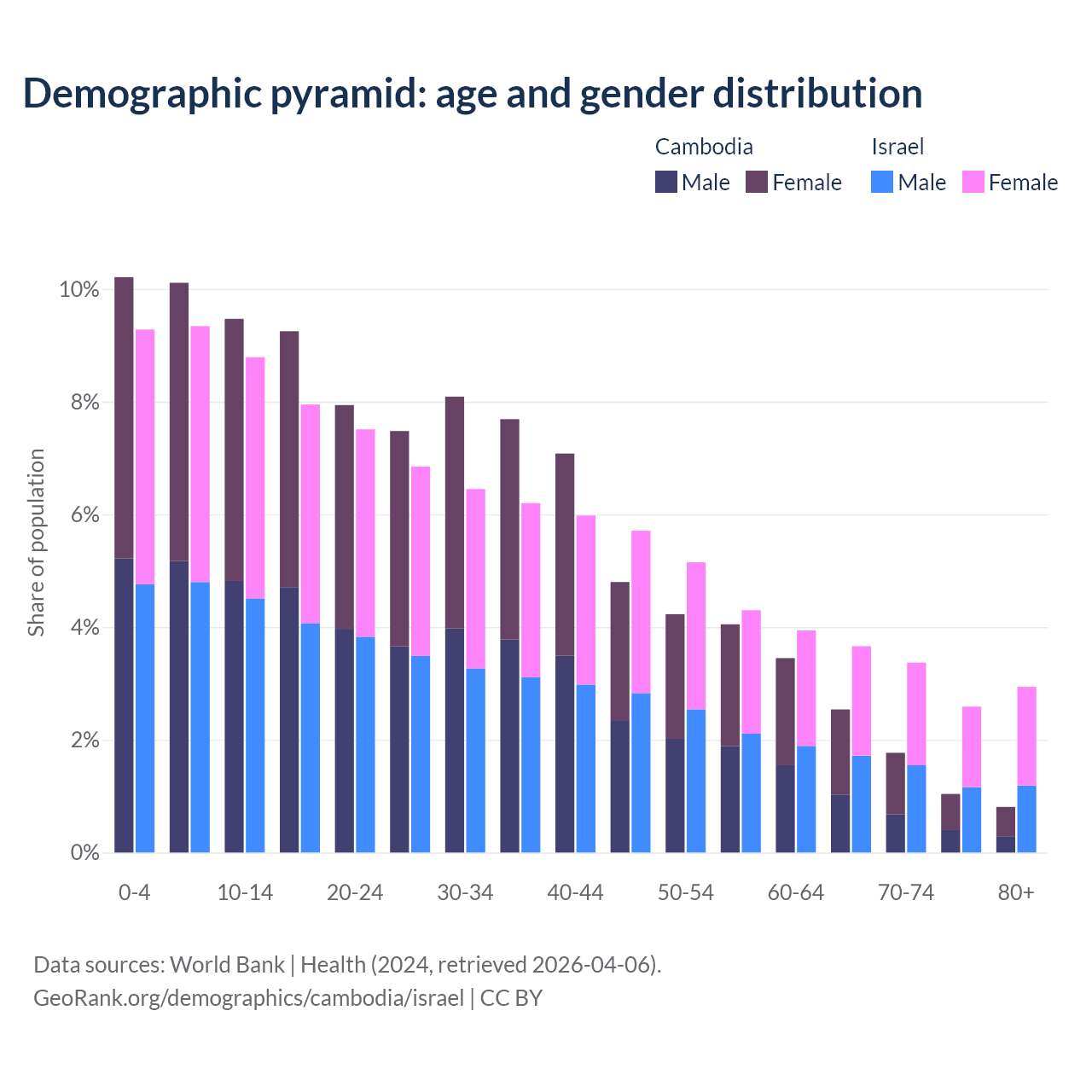 - Cambodia is ranked 121/196 by median age (oldest to youngest) vs 103/196 for Israel.