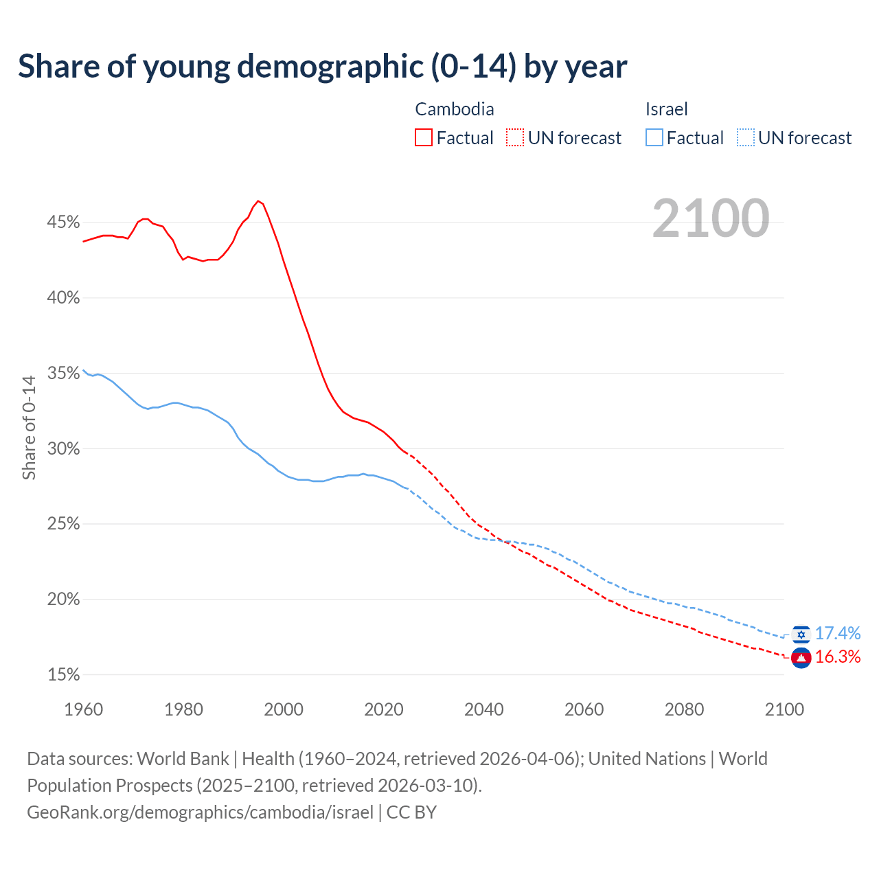 - The share of young demographic (0-15 years old) in Cambodia is 29.8% vs 27.4% in Israel.