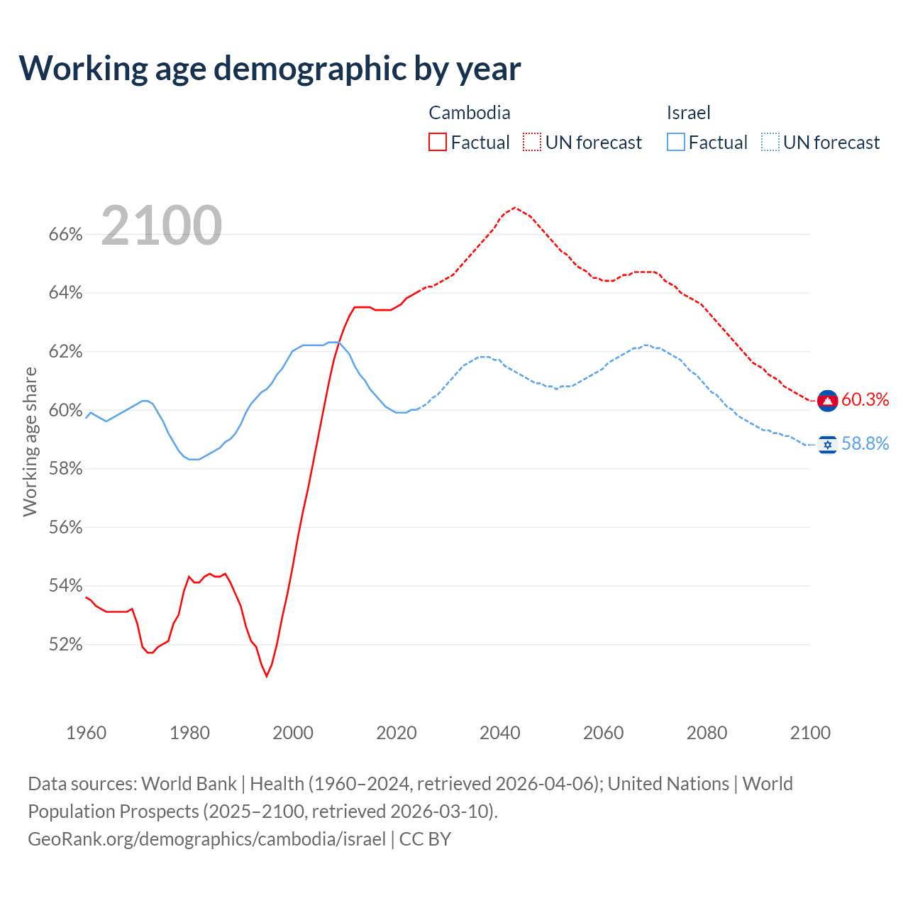 - Cambodia has 11.6M working age adults (aged 15-64) vs 6.18M in Israel.