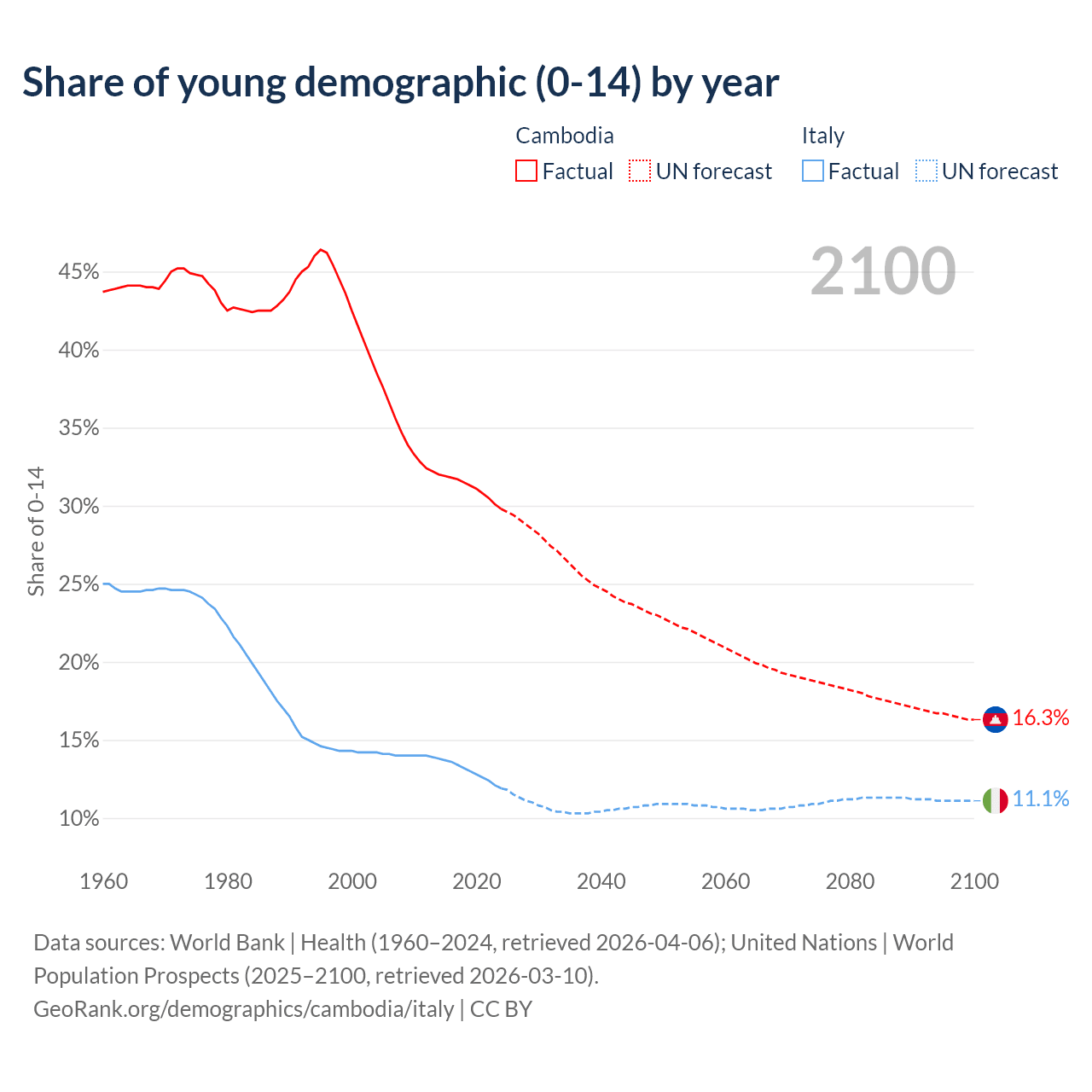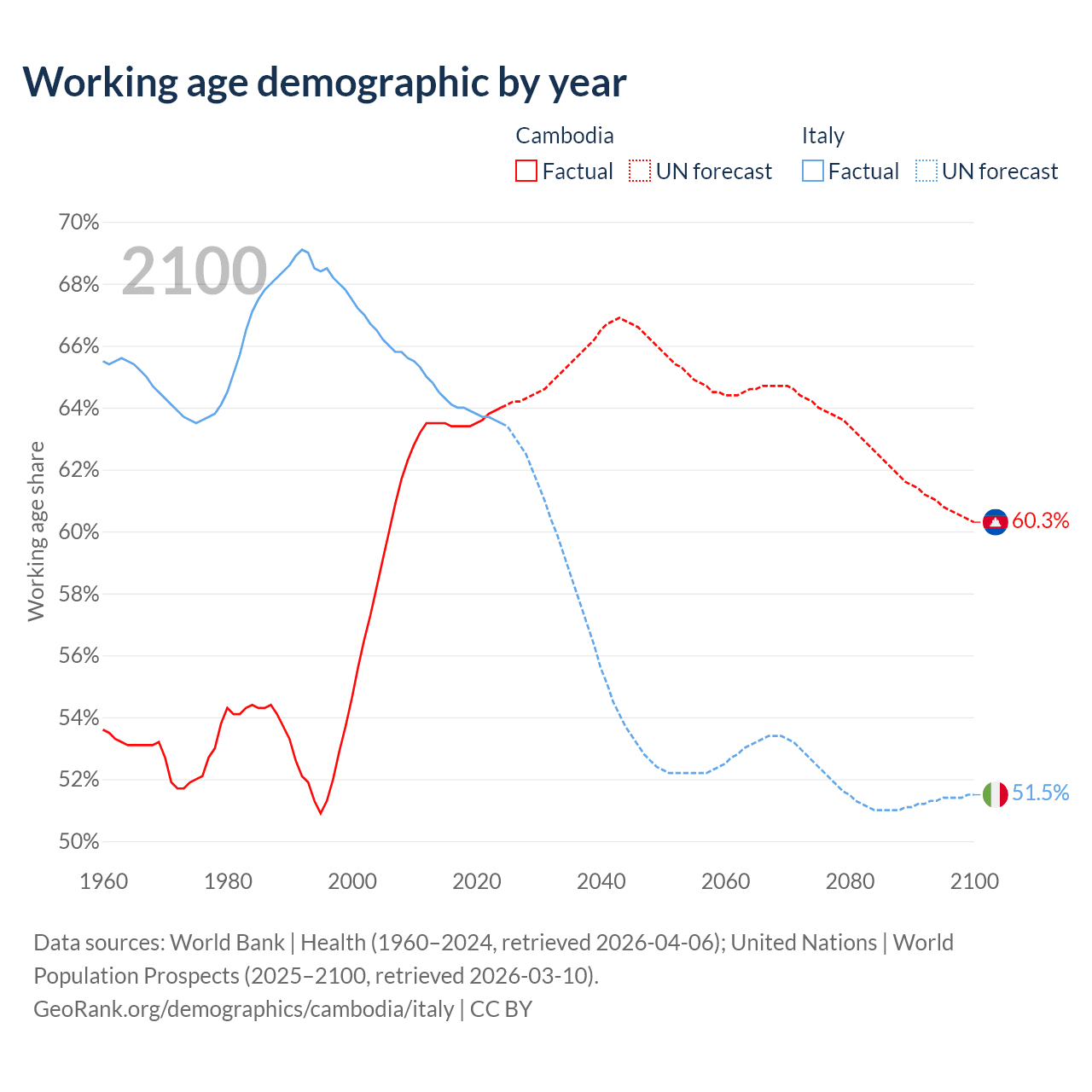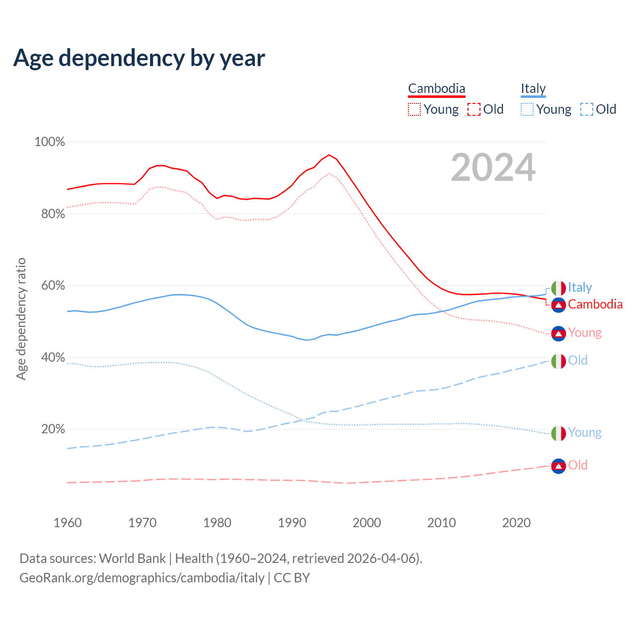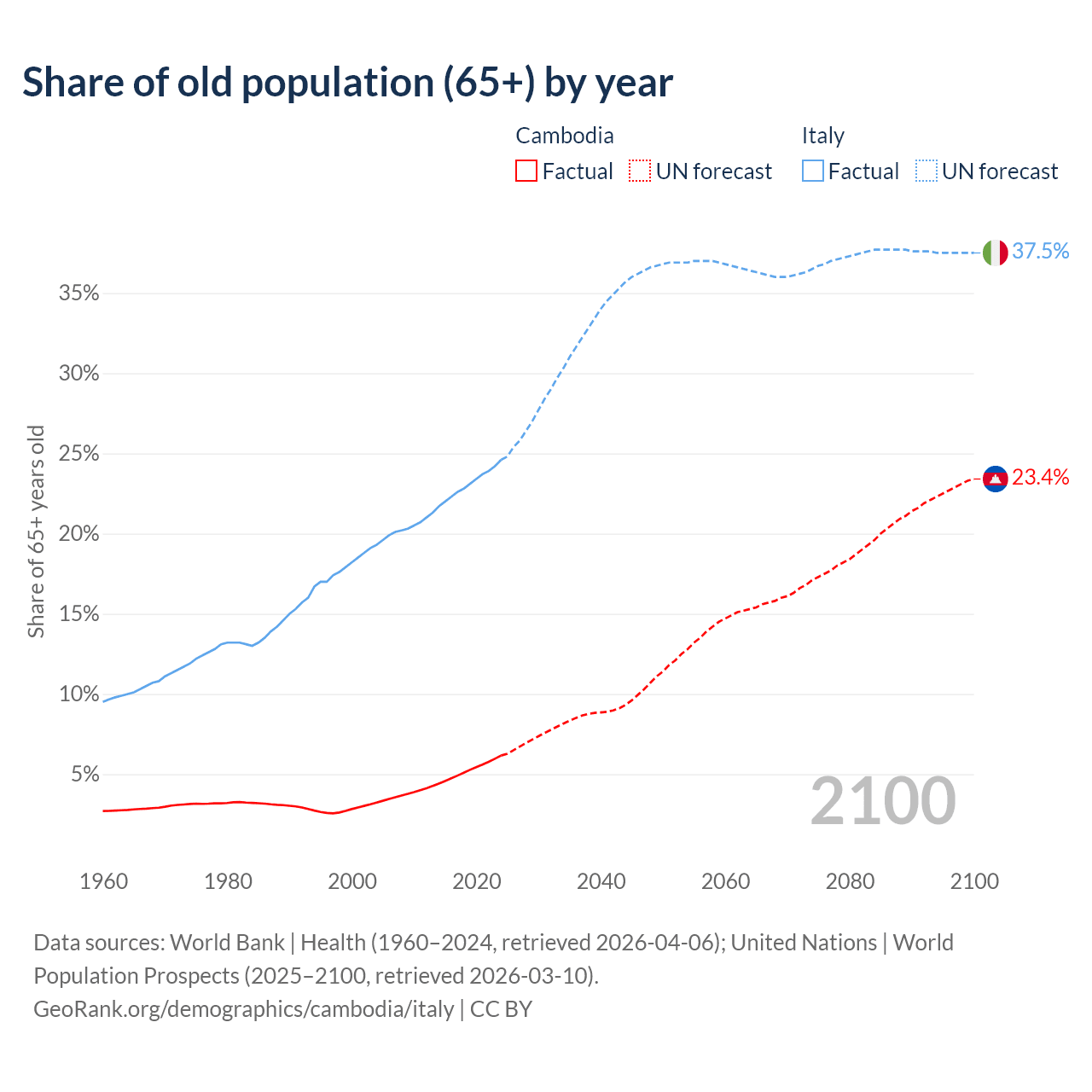 The share of older people aged 65 and over is 6.16% in Cambodia and 24.6% in Italy. Life expectancy in Cambodia compared to Italy .