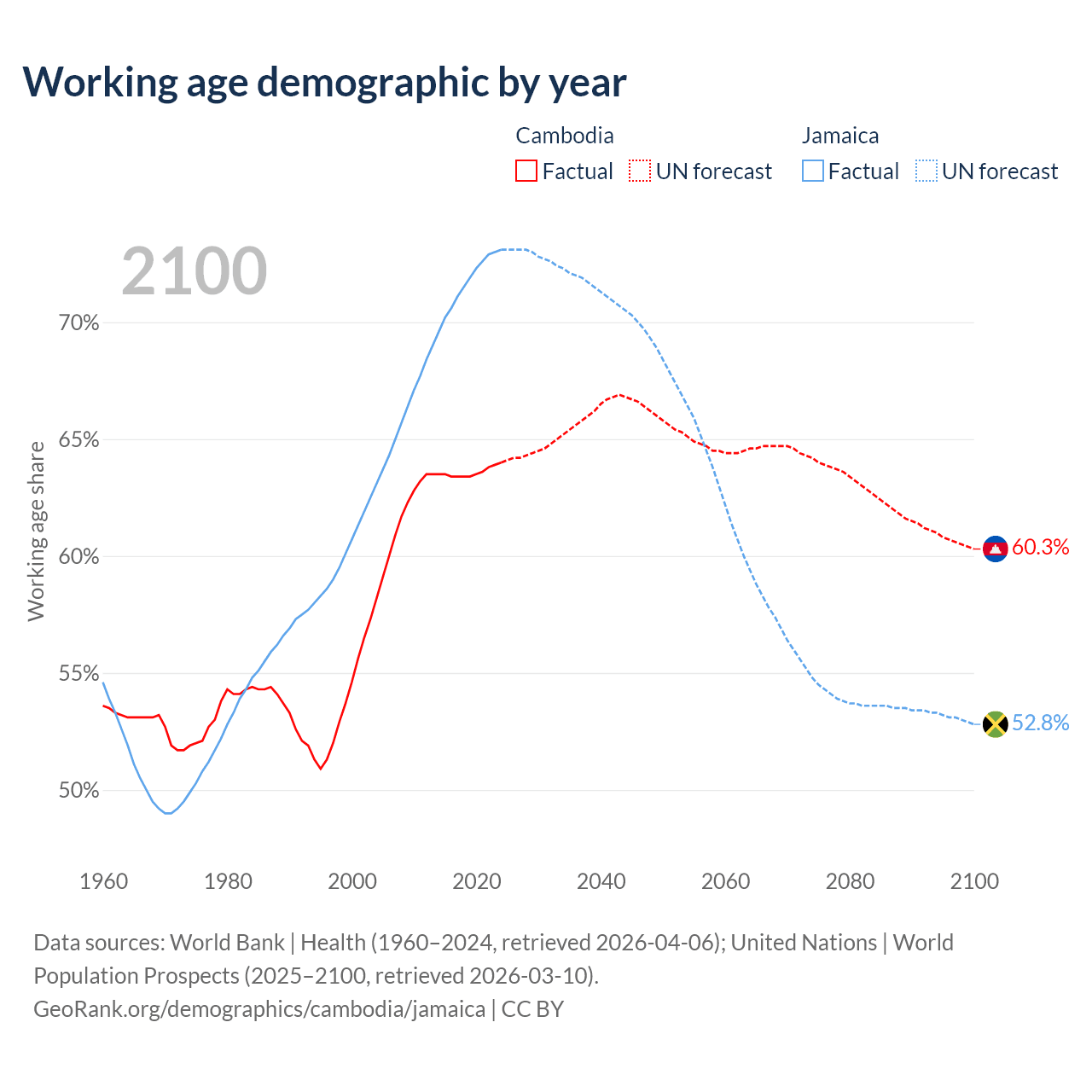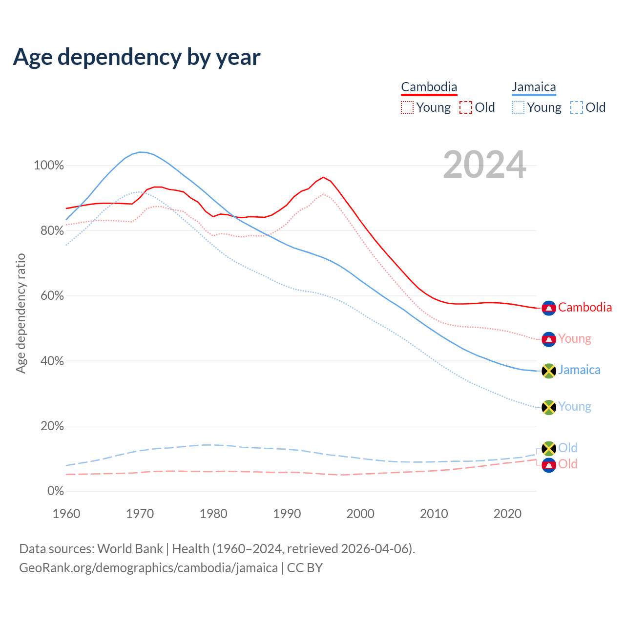The share of older people aged 65 and over is 6.16% in Cambodia and 8.21% in Jamaica. Life expectancy in Cambodia compared to Jamaica .