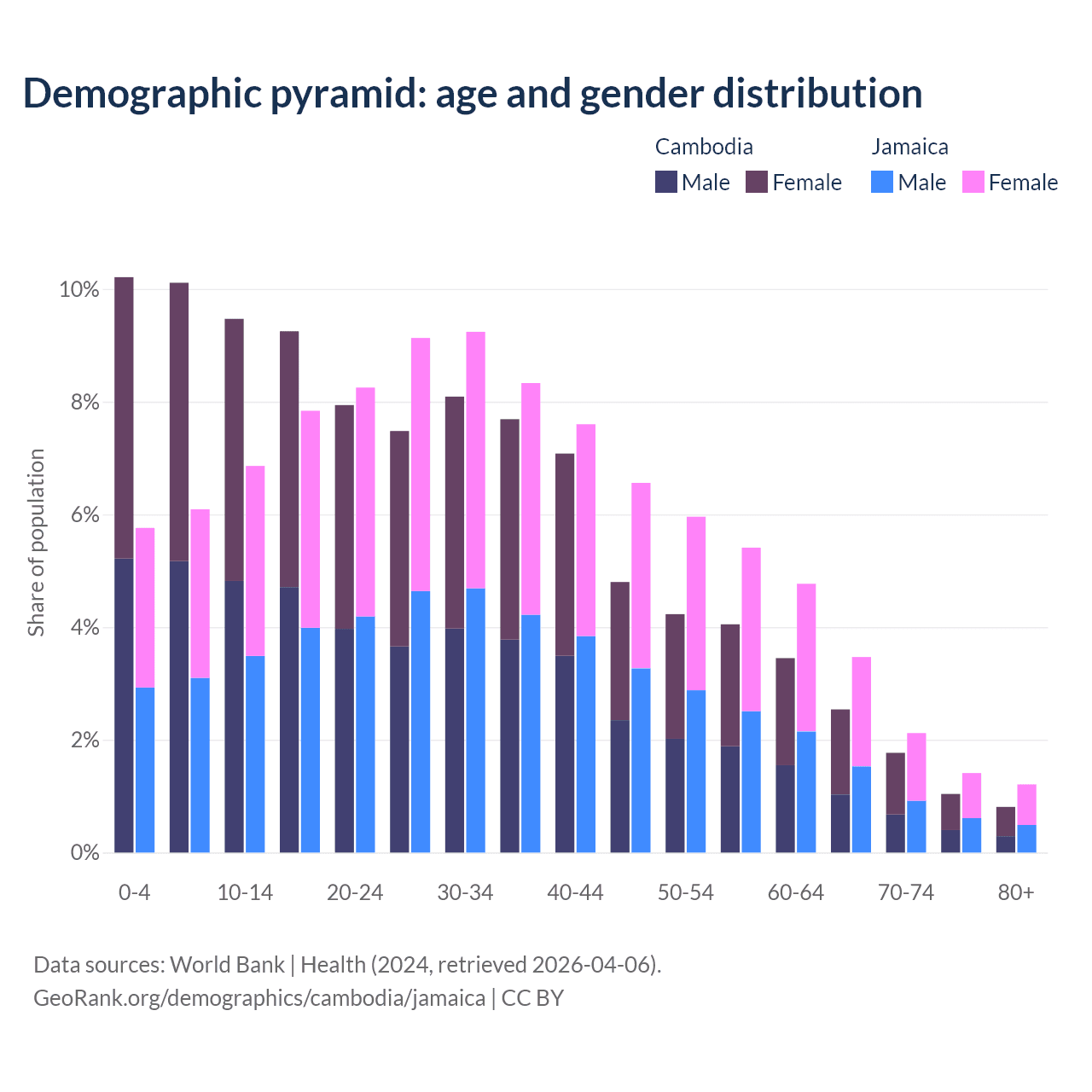 - Cambodia is ranked 121/196 by median age (oldest to youngest) vs 87/196 for Jamaica.