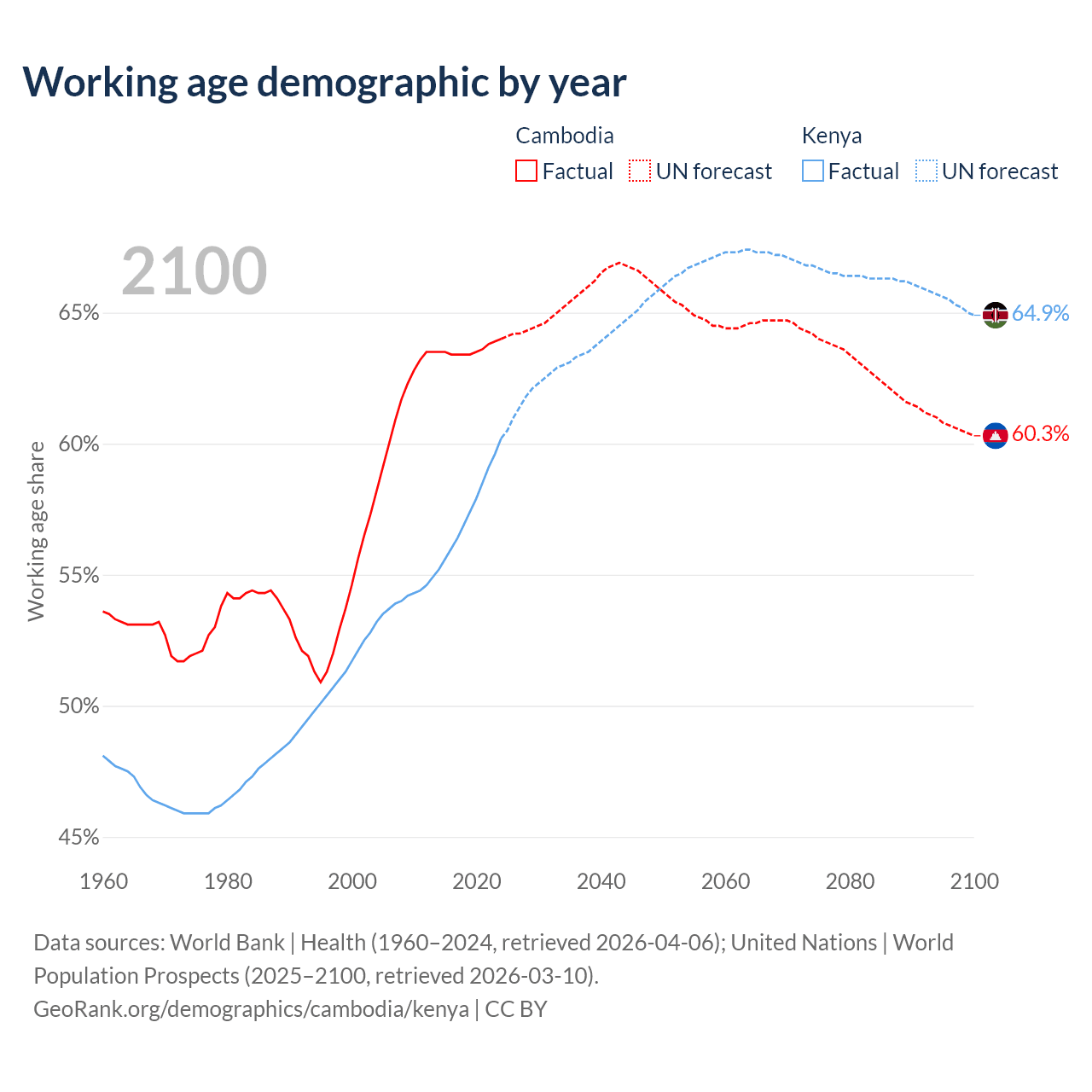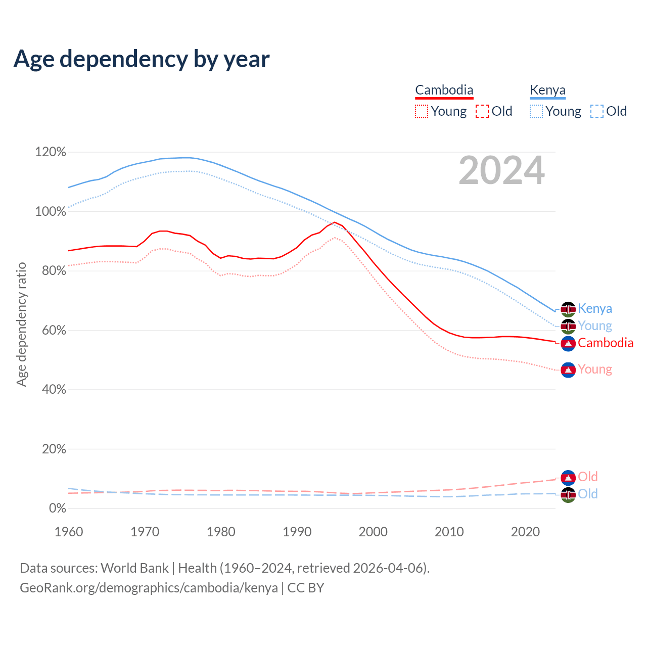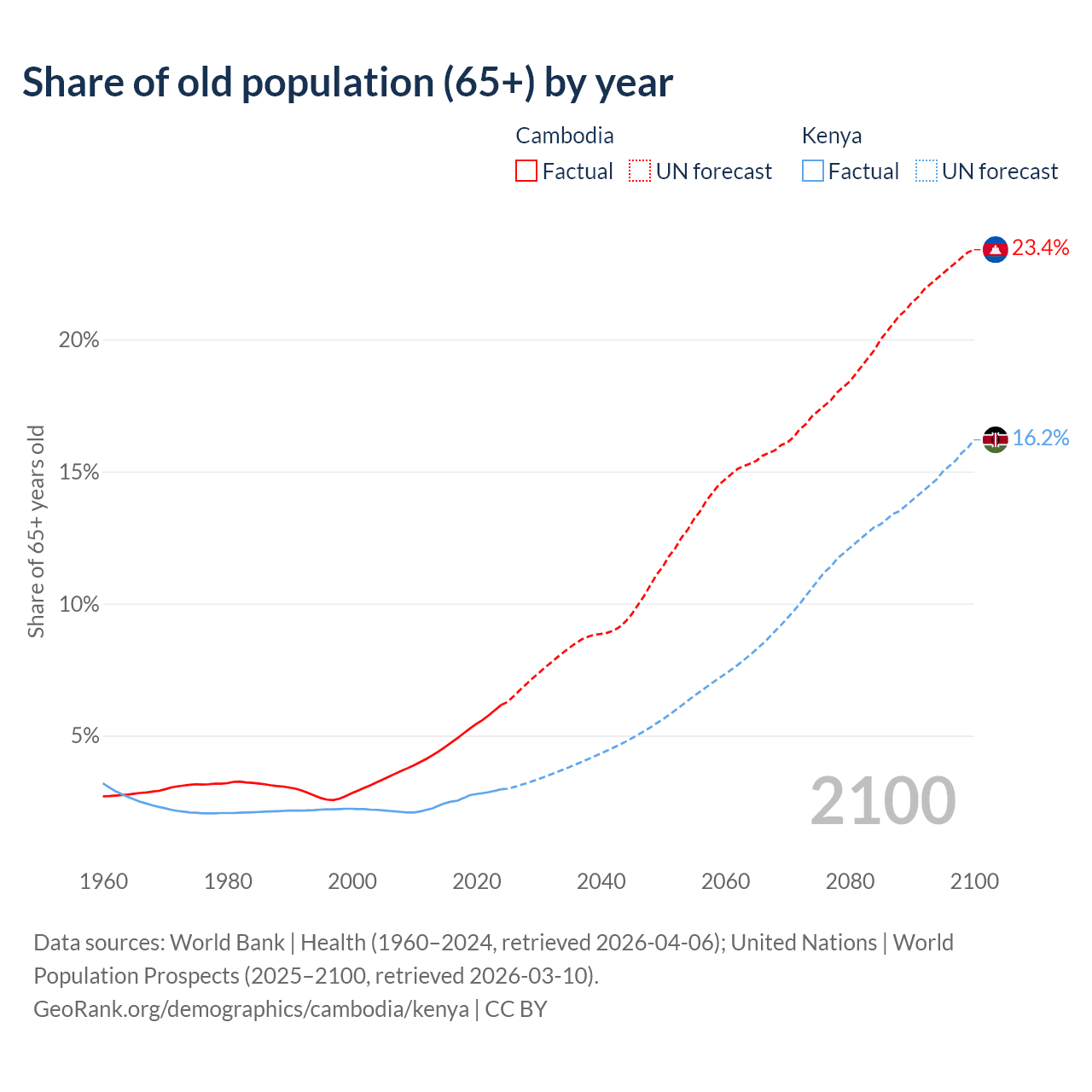 The share of older people aged 65 and over is 6.16% in Cambodia and 2.97% in Kenya. Life expectancy in Cambodia compared to Kenya .