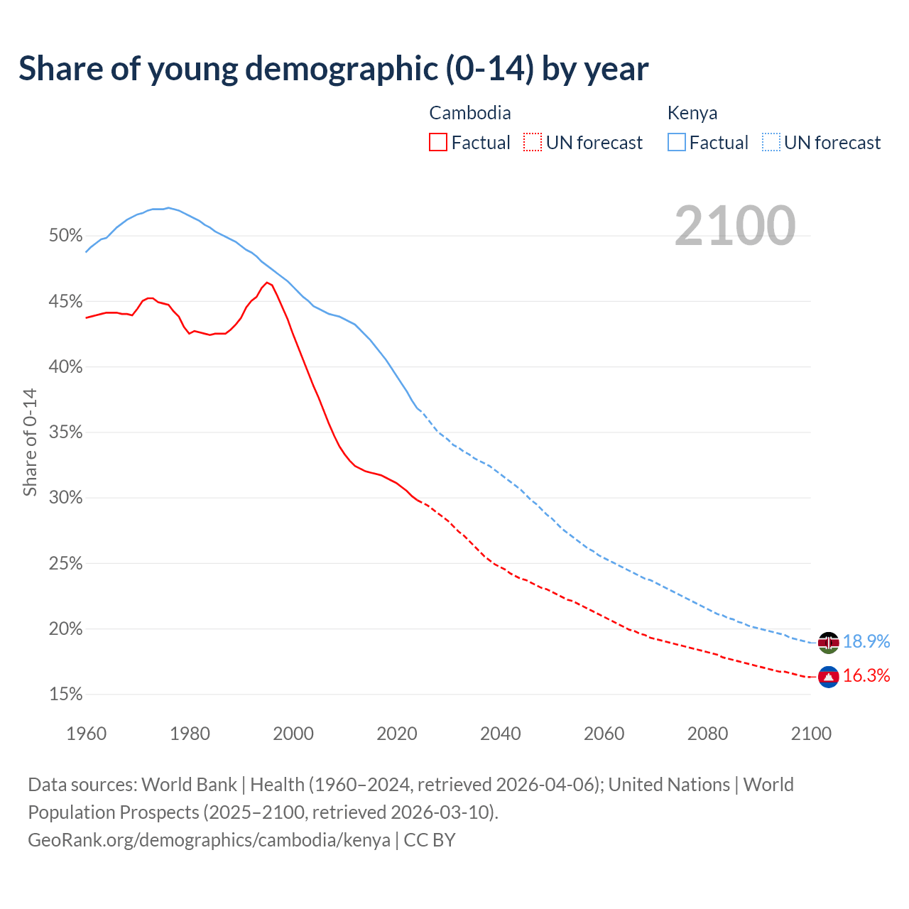 Median age Cambodia vs Kenya, 1960-2100
