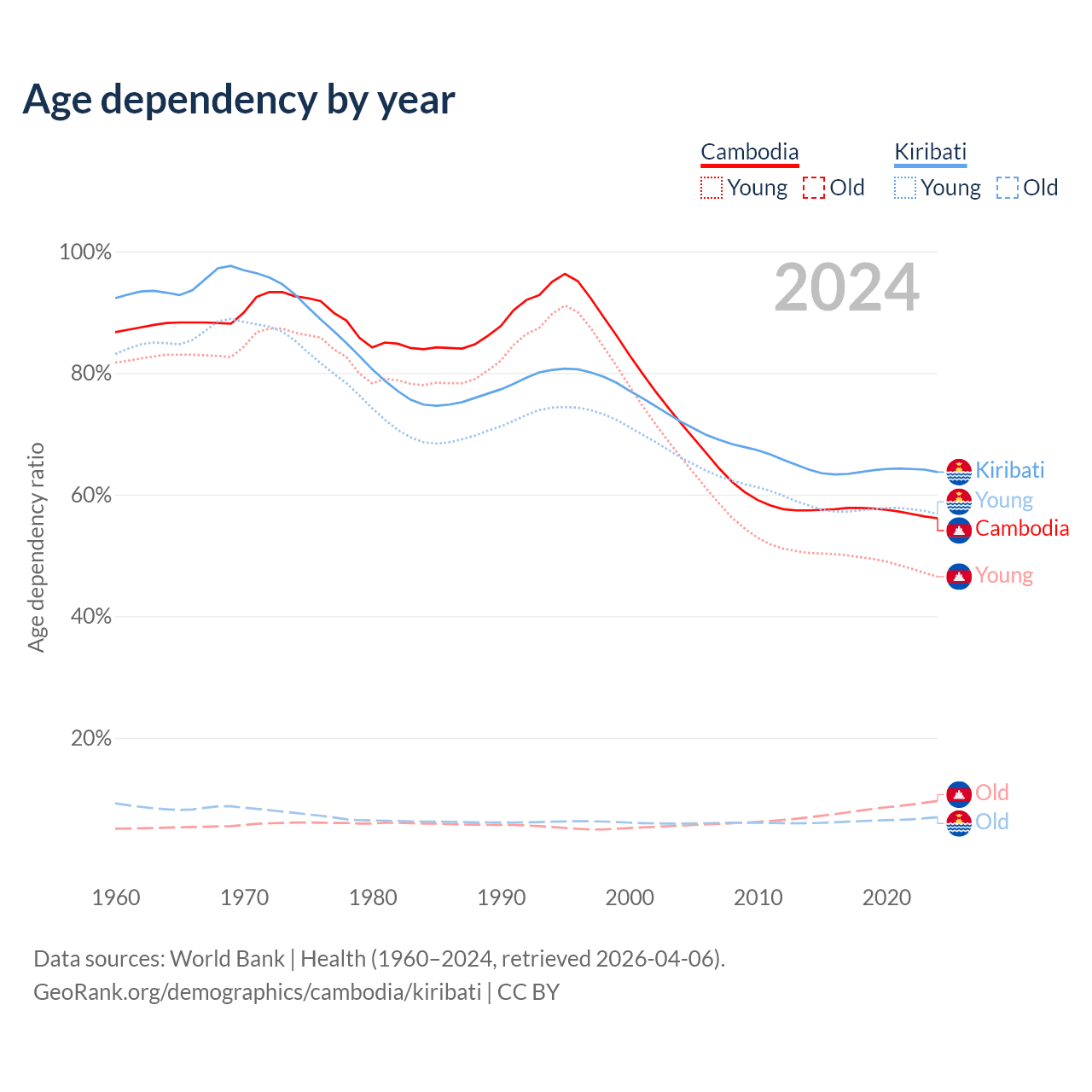 - The share of old-age demographic (65+) in Cambodia is 6.16% vs 4.24% in Kiribati.