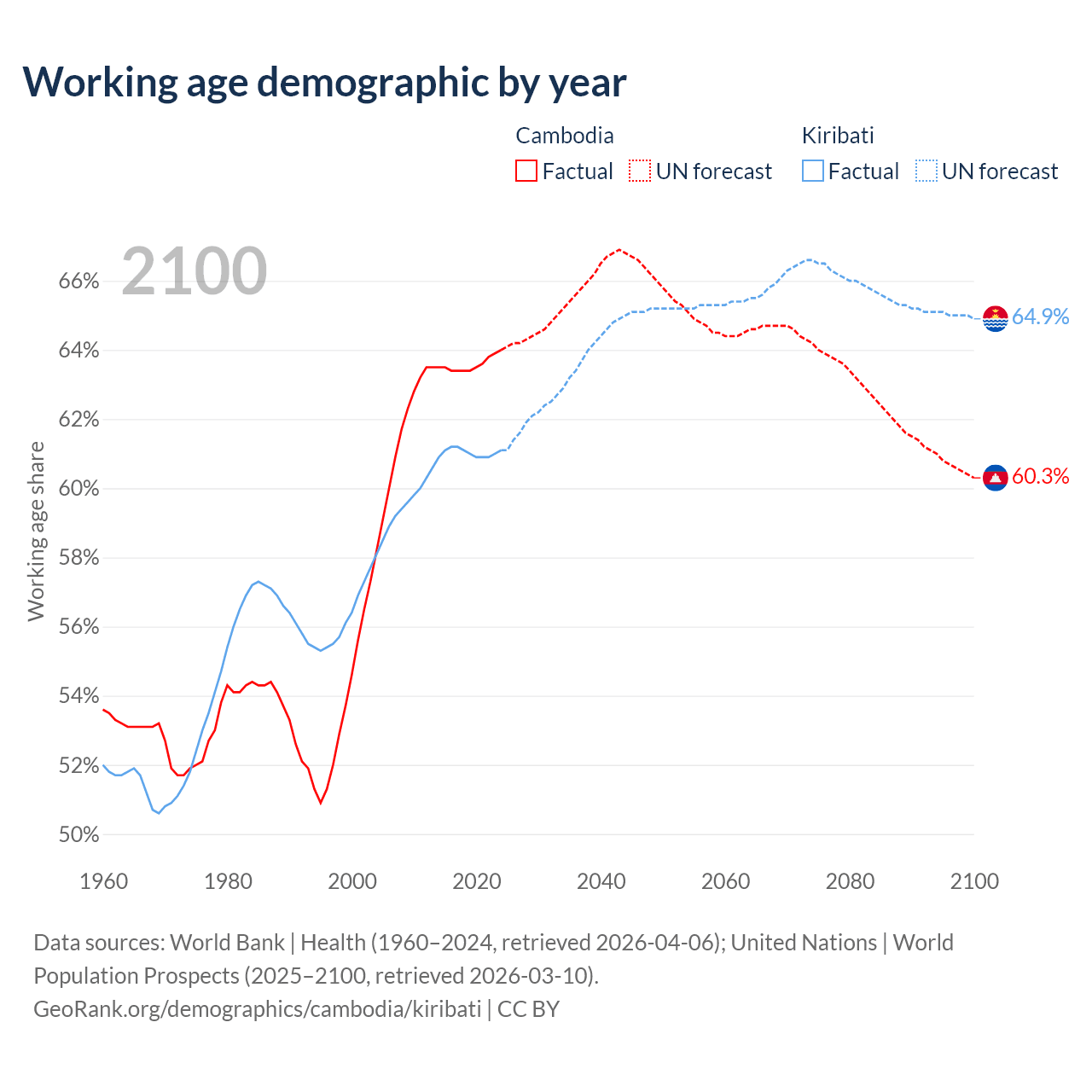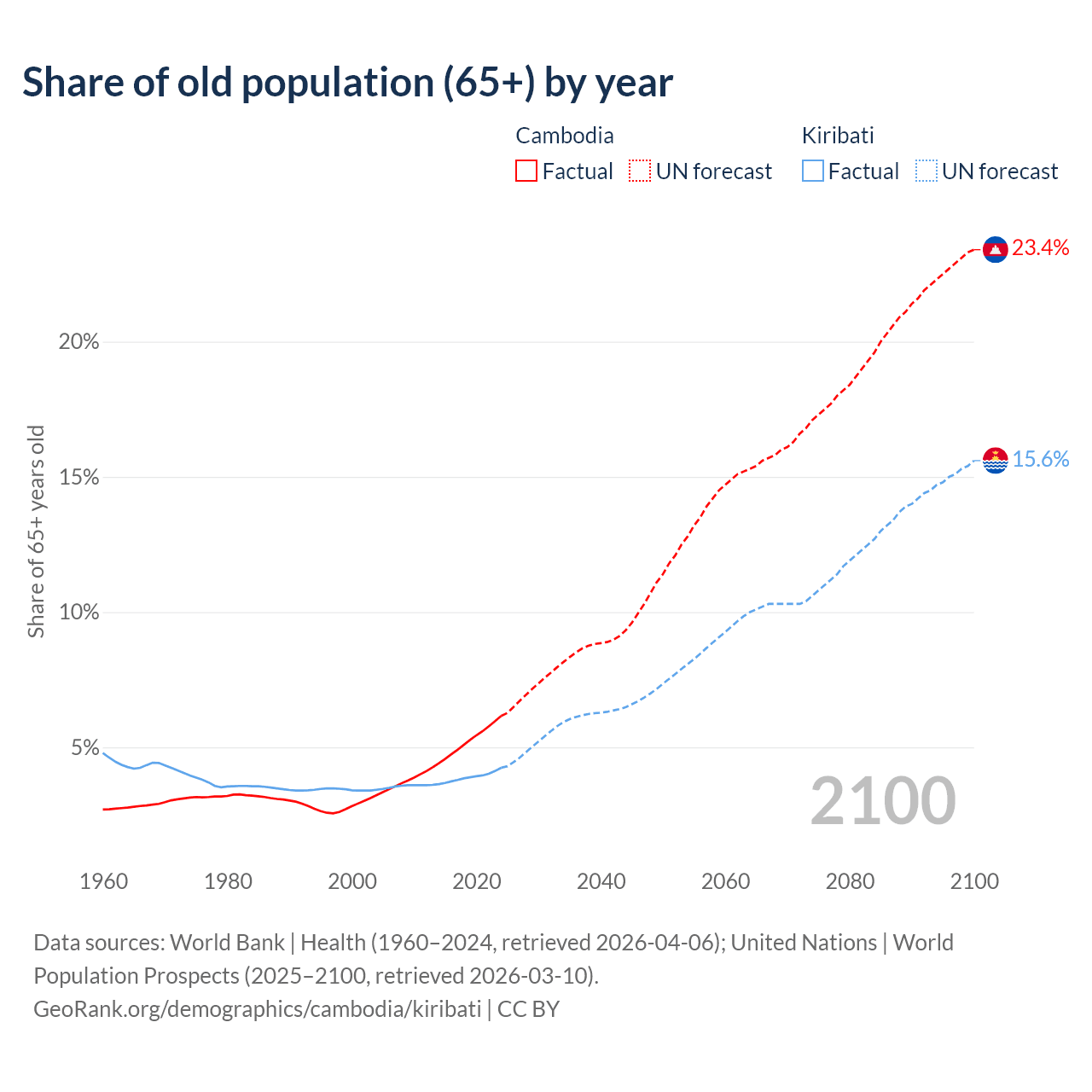 The share of older people aged 65 and over is 6.16% in Cambodia and 4.24% in Kiribati. Life expectancy in Cambodia compared to Kiribati .