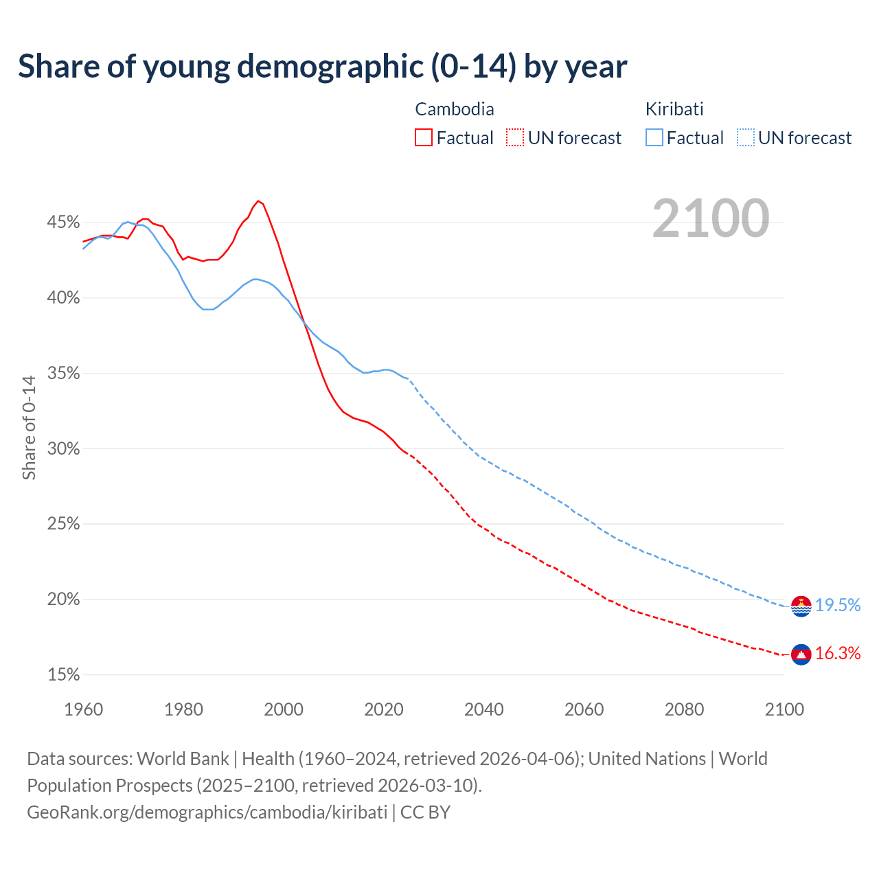 - The share of young demographic (0-15 years old) in Cambodia is 29.8% vs 34.7% in Kiribati.
