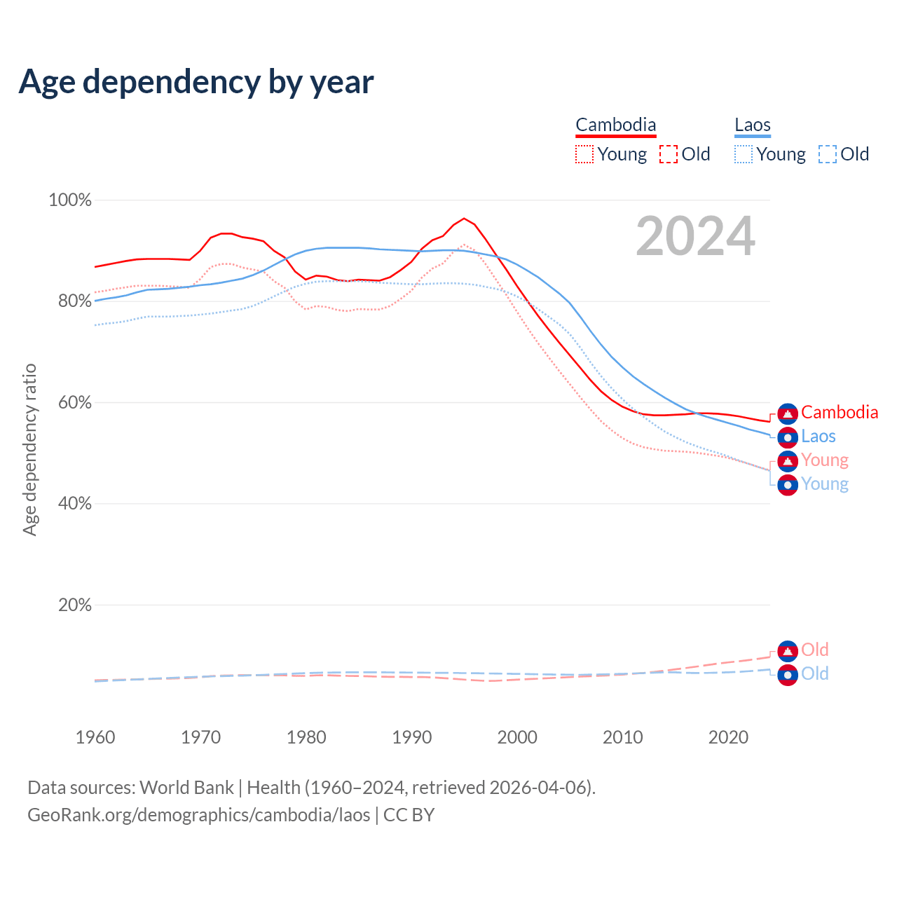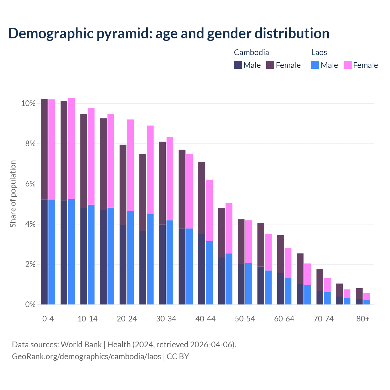 - Cambodia is ranked 121/196 by median age (oldest to youngest) vs 130/196 for Laos.