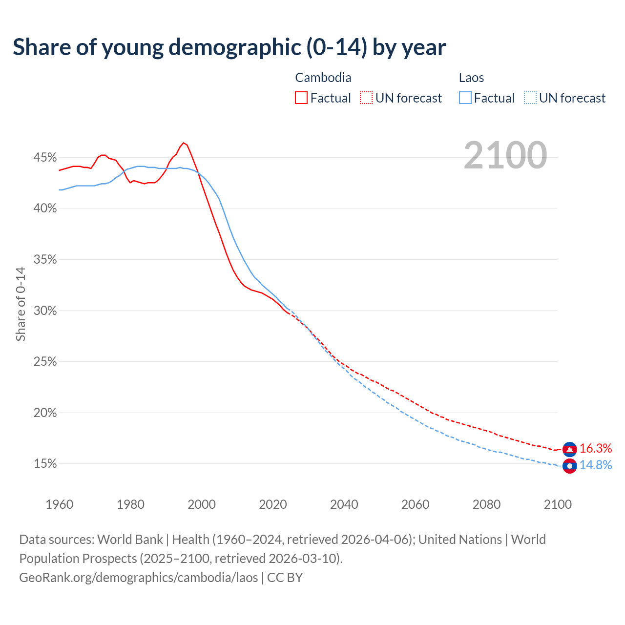 - The share of young demographic (0-15 years old) in Cambodia is 29.8% vs 30.2% in Laos.