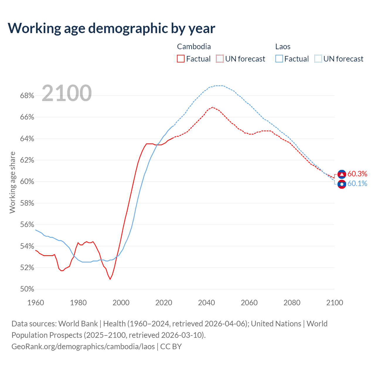 - Cambodia has 11.6M working age adults (aged 15-64) vs 5.21M in Laos.