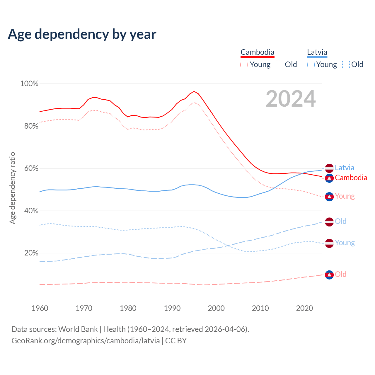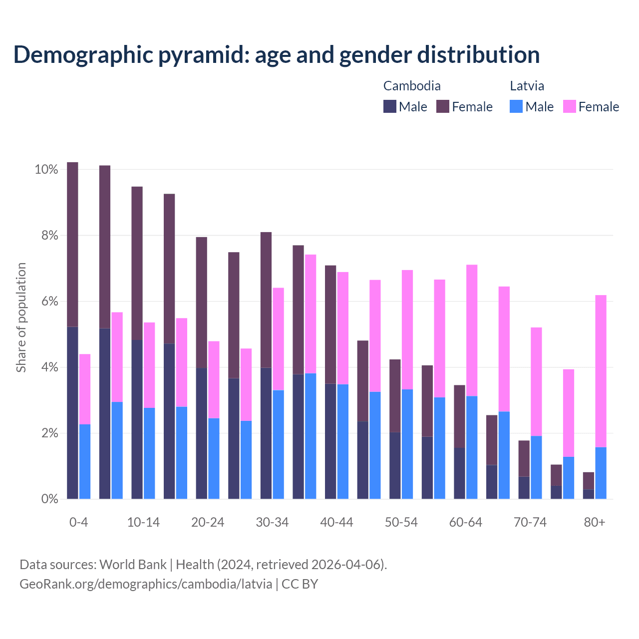 - Cambodia is ranked 121/196 by median age (oldest to youngest) vs 20/196 for Latvia.