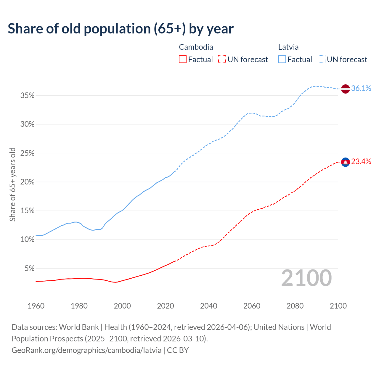 The share of older people aged 65 and over is 6.16% in Cambodia and 21.7% in Latvia. Life expectancy in Cambodia compared to Latvia .
