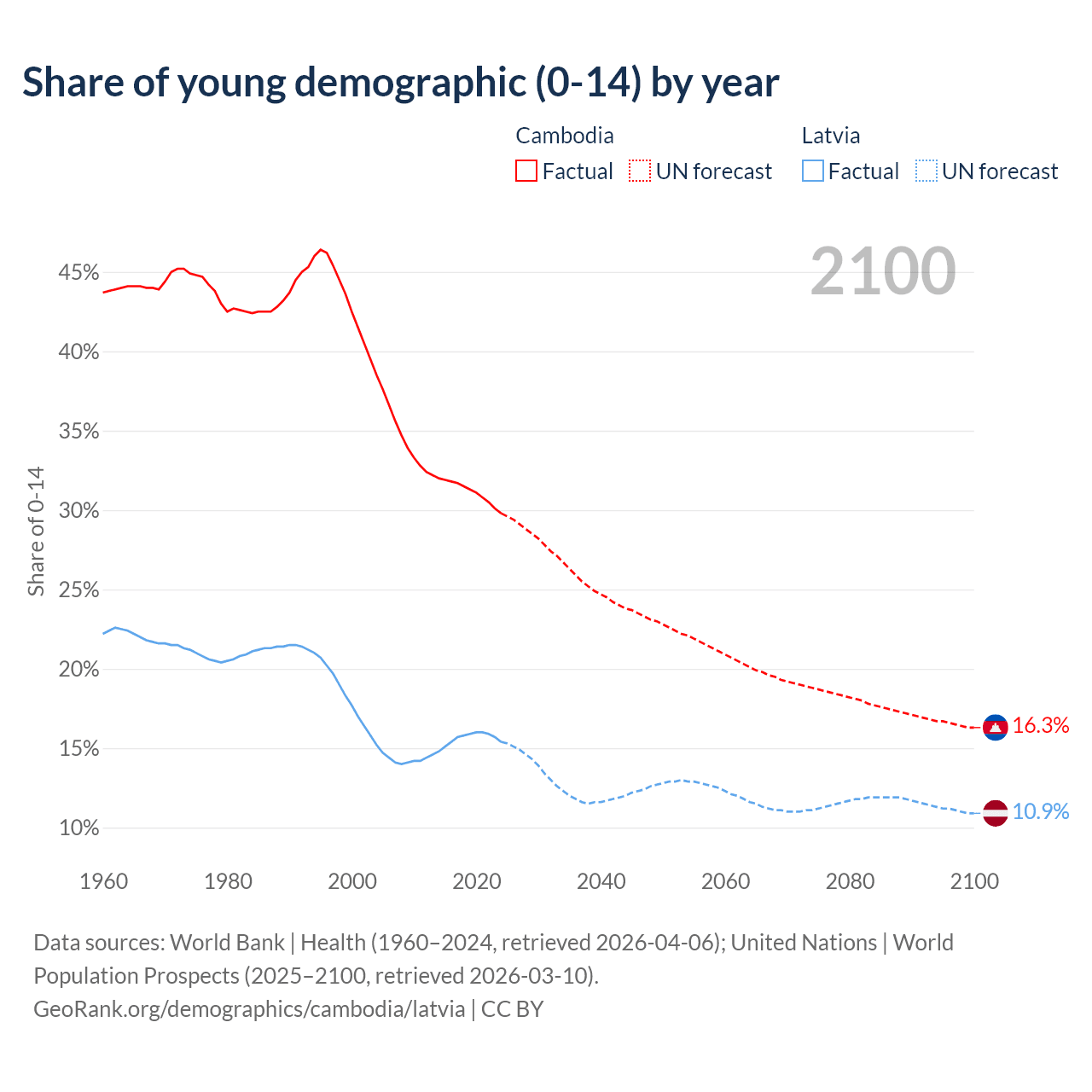 - The share of young demographic (0-15 years old) in Cambodia is 29.8% vs 15.4% in Latvia.