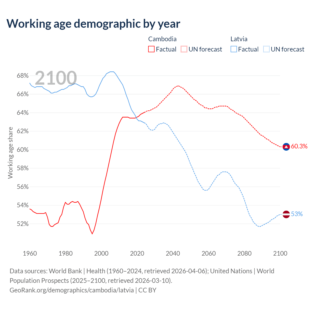 - Cambodia has 11.6M working age adults (aged 15-64) vs 1.15M in Latvia.