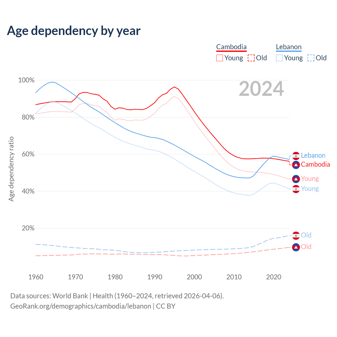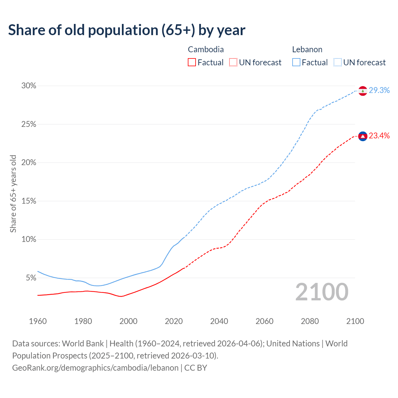The share of older people aged 65 and over is 6.16% in Cambodia and 10.1% in Lebanon. Life expectancy in Cambodia compared to Lebanon .