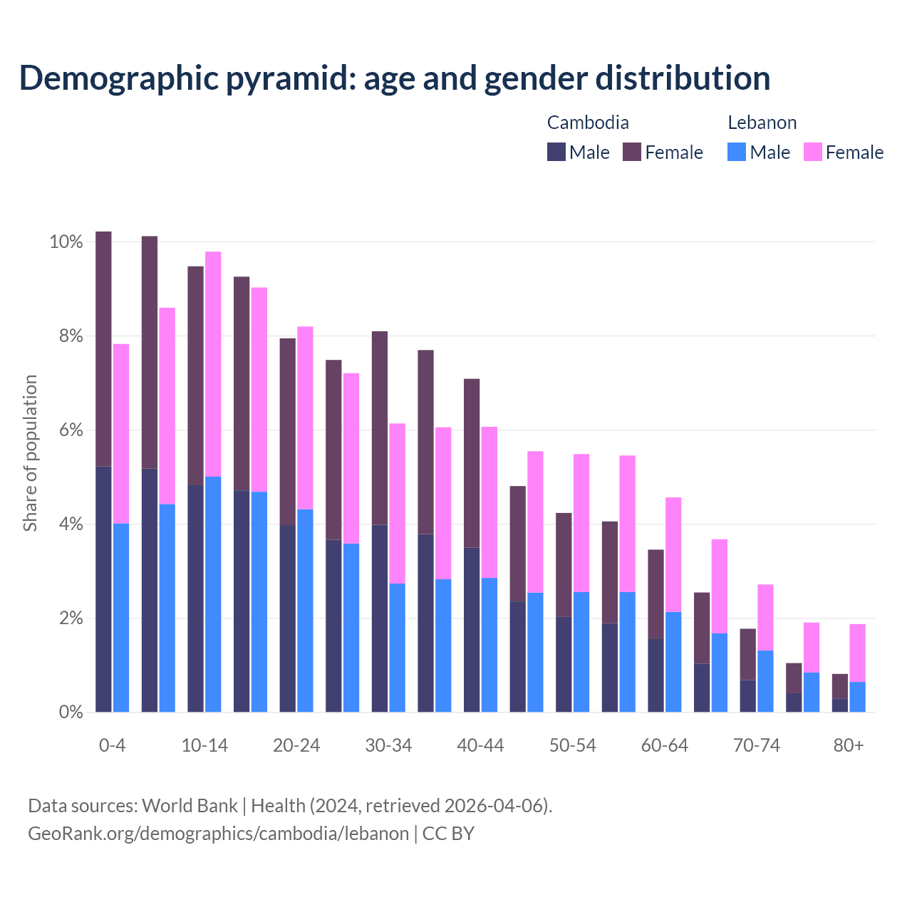 - Cambodia is ranked 121/196 by median age (oldest to youngest) vs 106/196 for Lebanon.