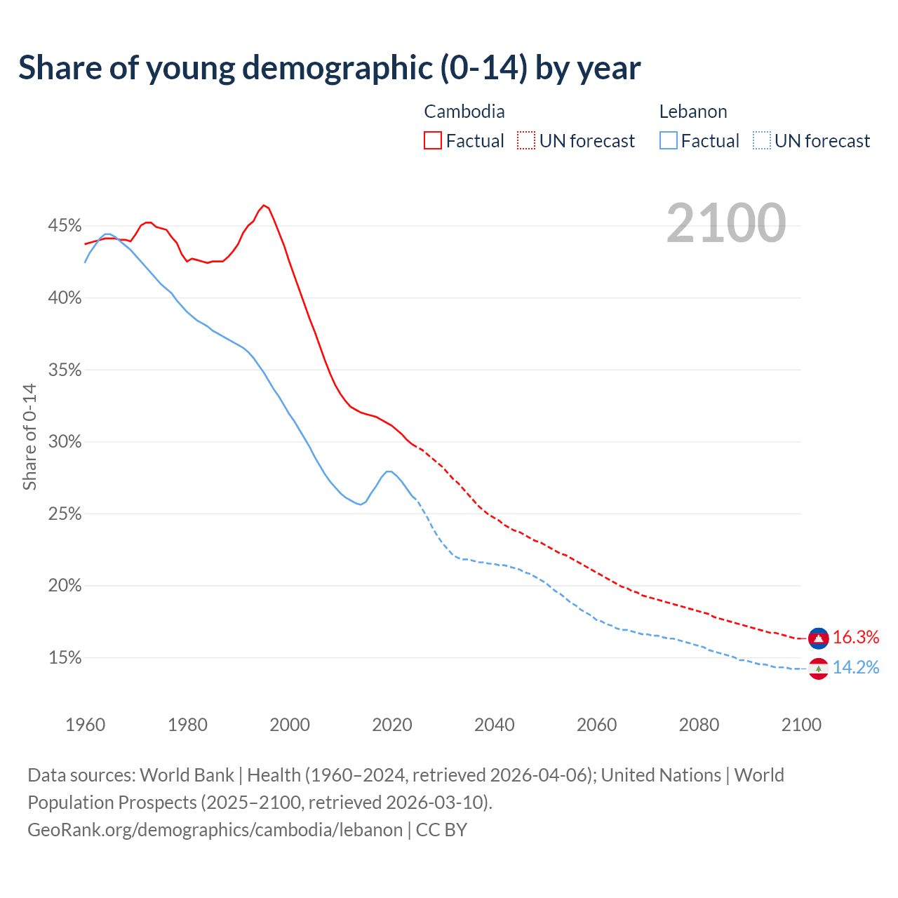 - The share of young demographic (0-15 years old) in Cambodia is 29.8% vs 26.2% in Lebanon.