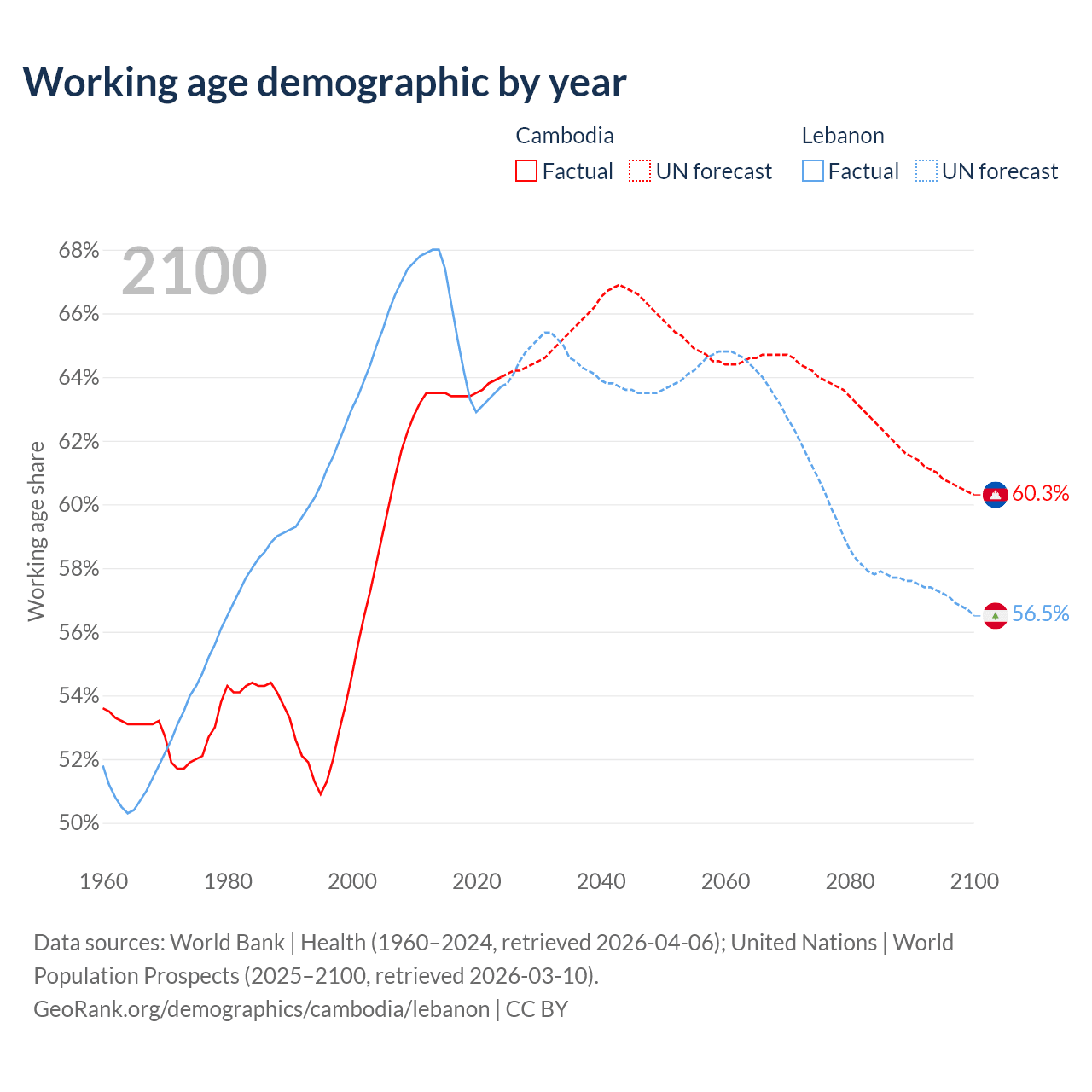 - Cambodia has 11.6M working age adults (aged 15-64) vs 3.76M in Lebanon.