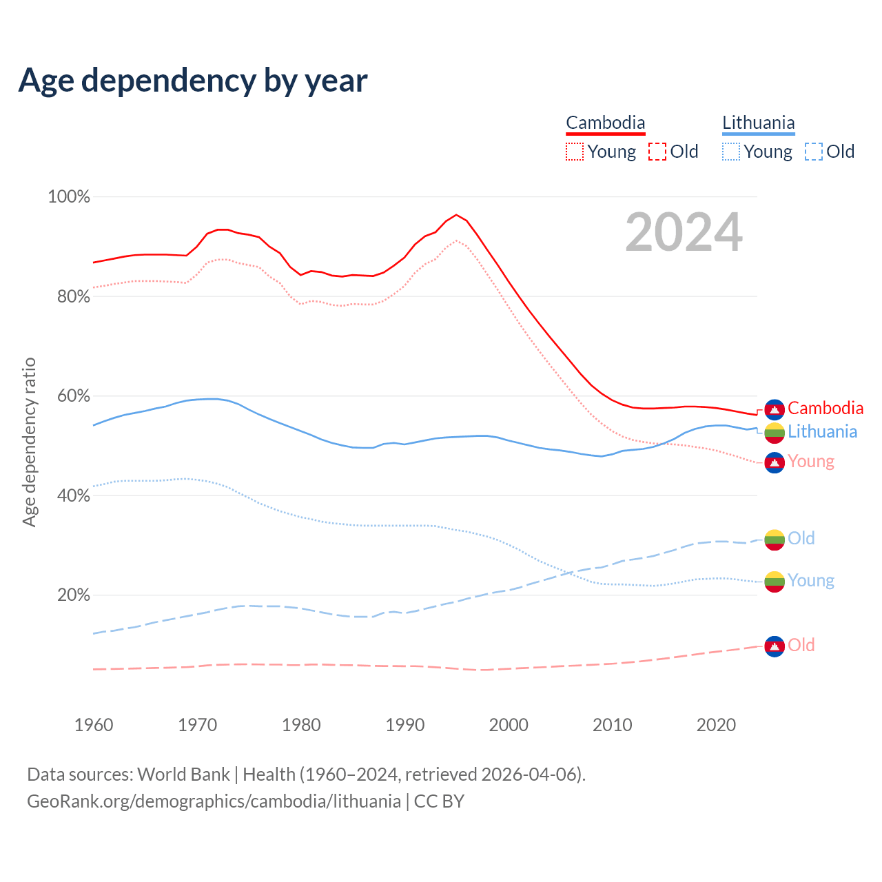- The share of old-age demographic (65+) in Cambodia is 6.16% vs 20.2% in Lithuania.