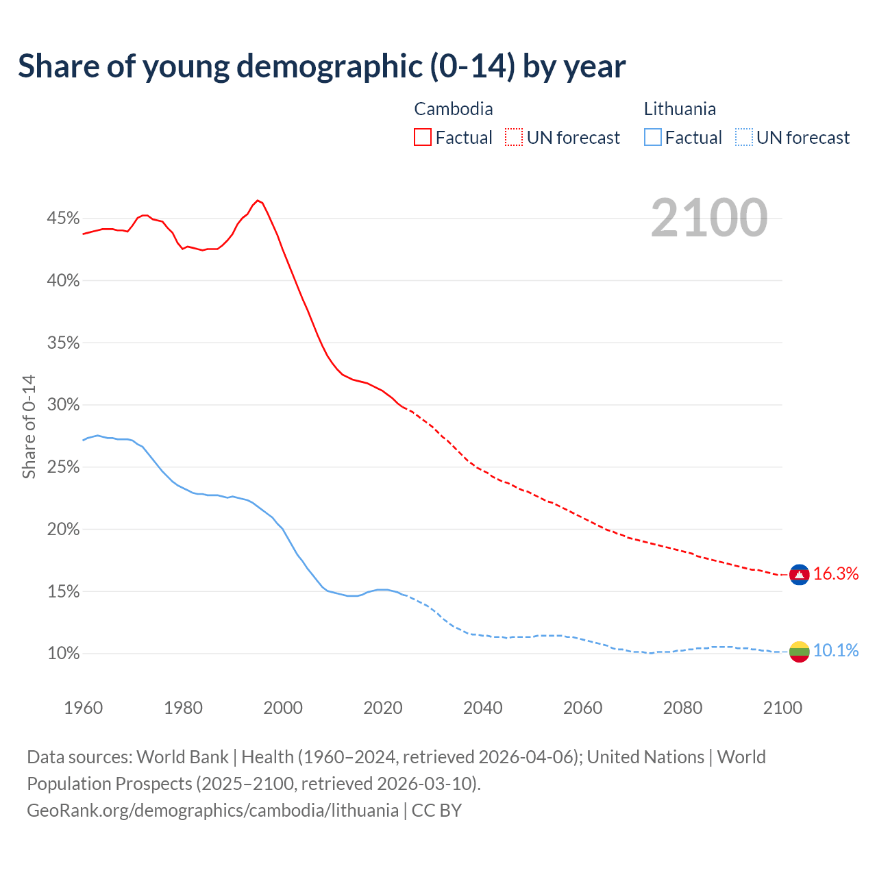 - The share of young demographic (0-15 years old) in Cambodia is 29.8% vs 14.7% in Lithuania.