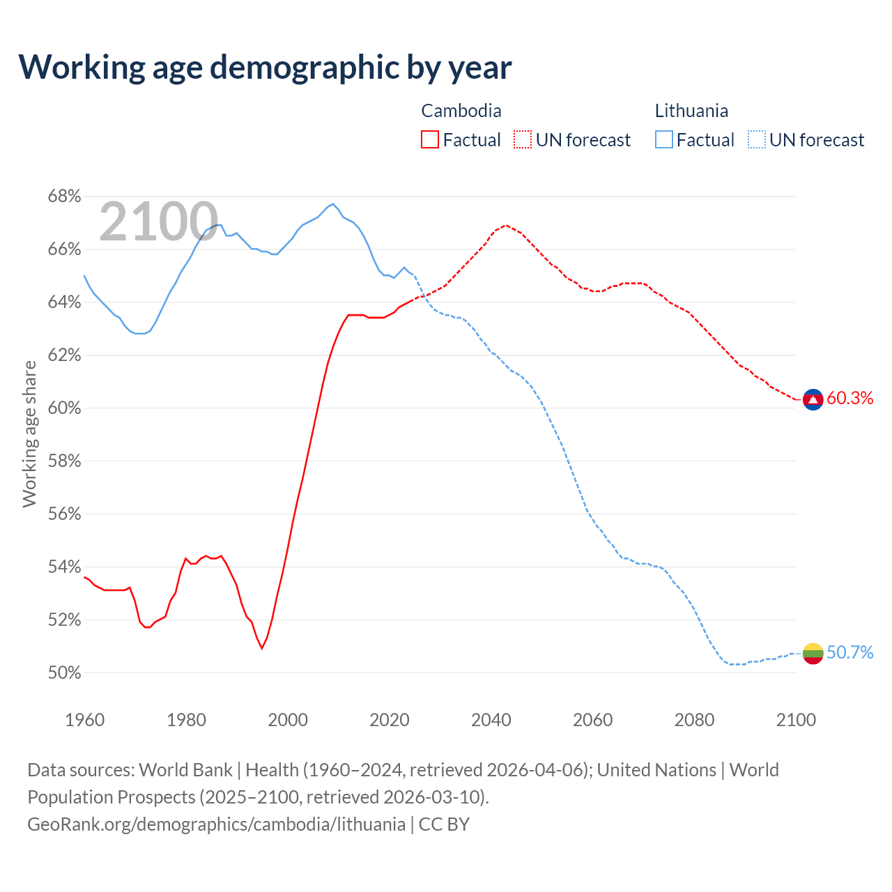 The share of older people aged 65 and over is 6.16% in Cambodia and 20.2% in Lithuania. Life expectancy in Cambodia compared to Lithuania .