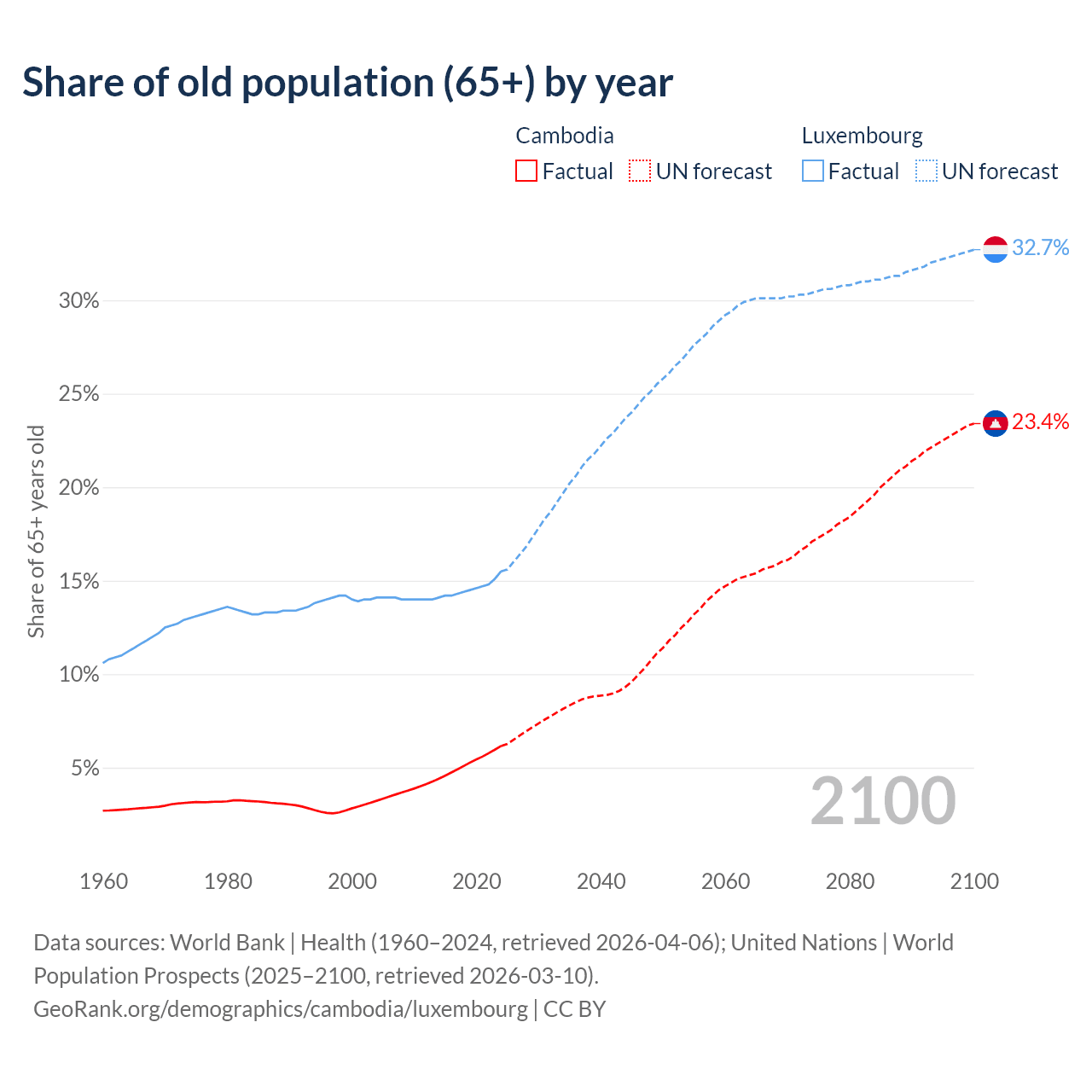 The share of older people aged 65 and over is 6.16% in Cambodia and 15.5% in Luxembourg. Life expectancy in Cambodia compared to Luxembourg .