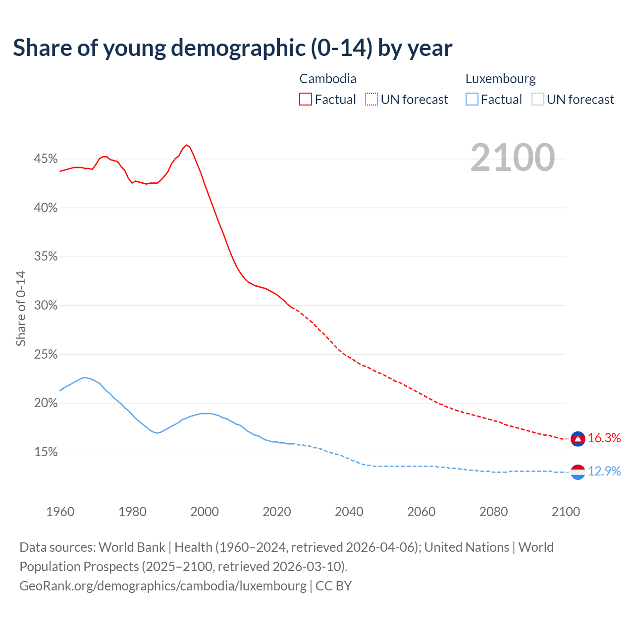 - The share of young demographic (0-15 years old) in Cambodia is 29.8% vs 15.8% in Luxembourg.