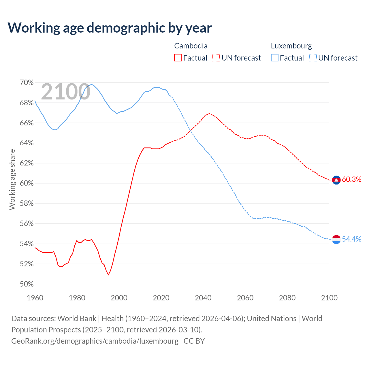- Cambodia has 11.6M working age adults (aged 15-64) vs 477K in Luxembourg.