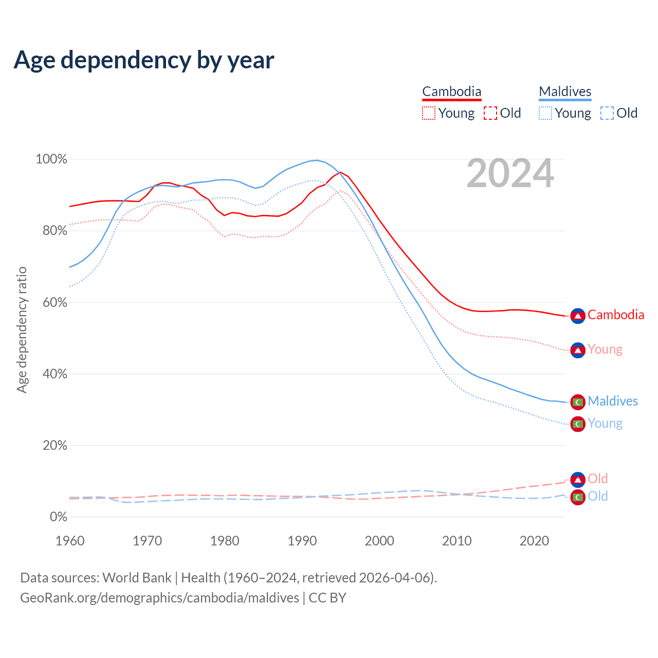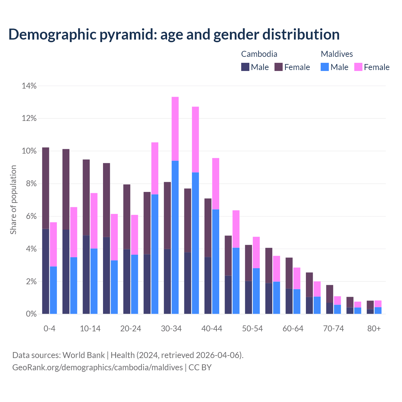 - Cambodia is ranked 121/196 by median age (oldest to youngest) vs 90/196 for Maldives.