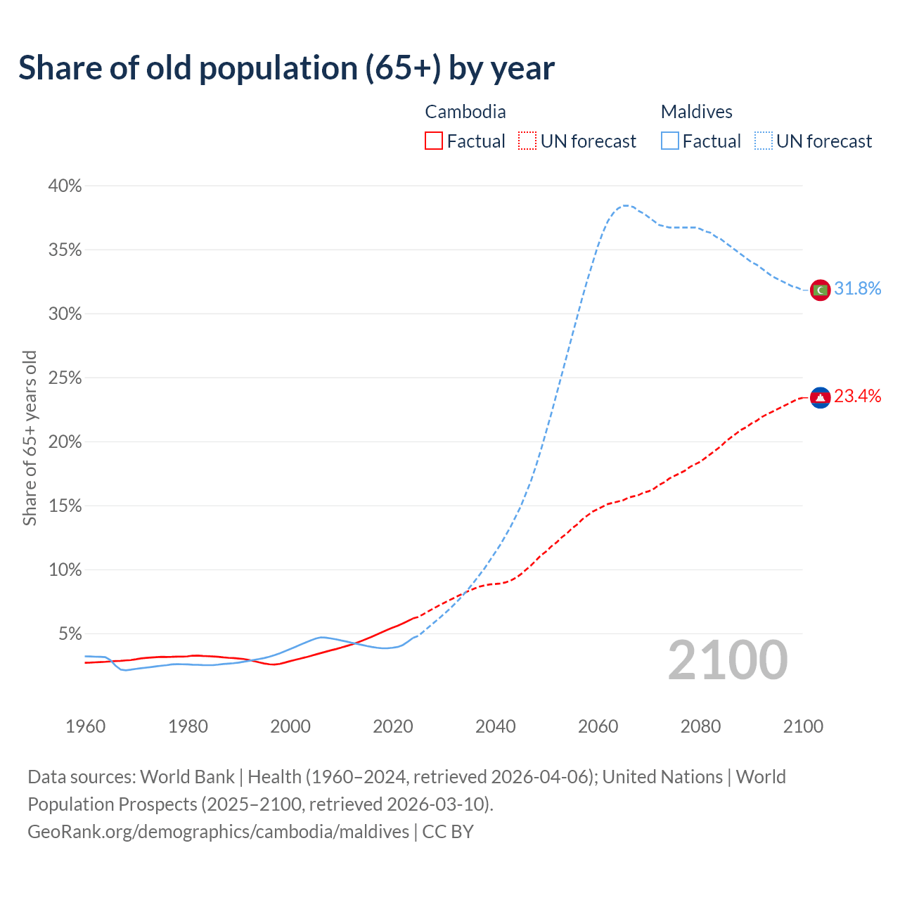 The share of older people aged 65 and over is 6.16% in Cambodia and 4.64% in Maldives. Life expectancy in Cambodia compared to Maldives .