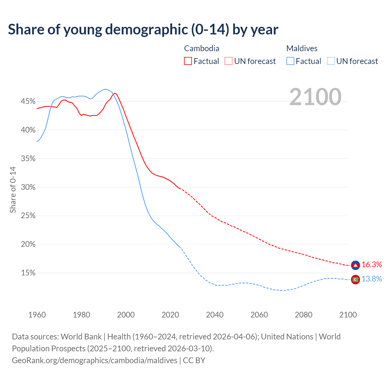 - As of 2026, the population of Cambodia is 18.1M vs 532K in Maldives - 34 times difference.