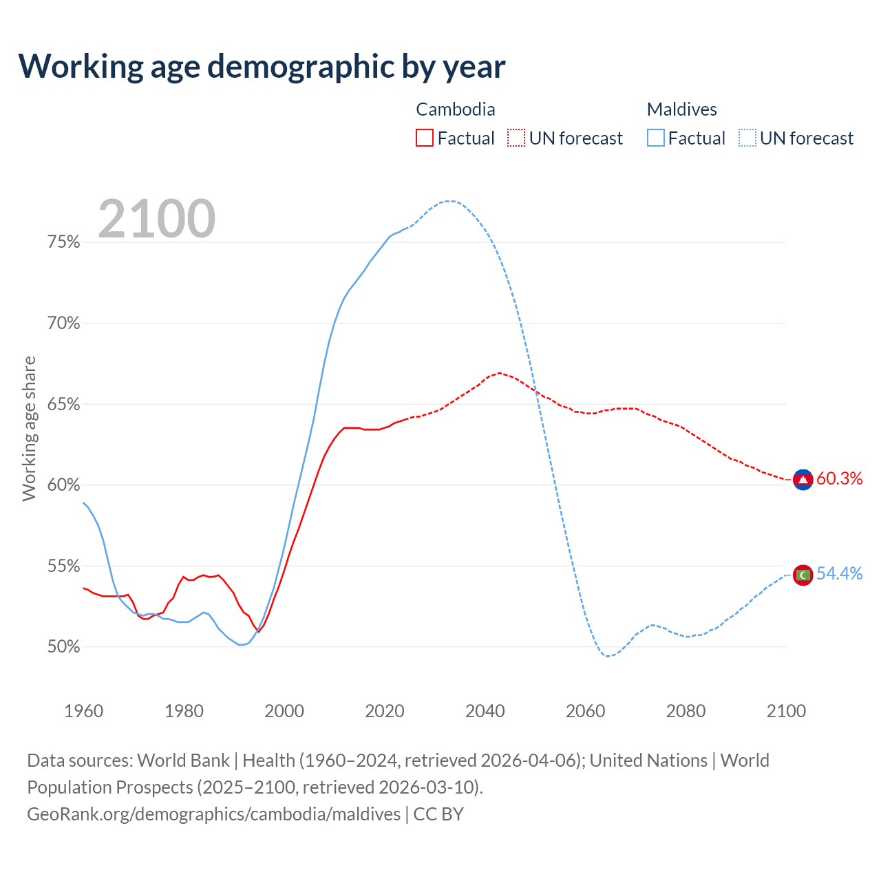 - Cambodia has 11.6M working age adults (aged 15-64) vs 403K in Maldives.