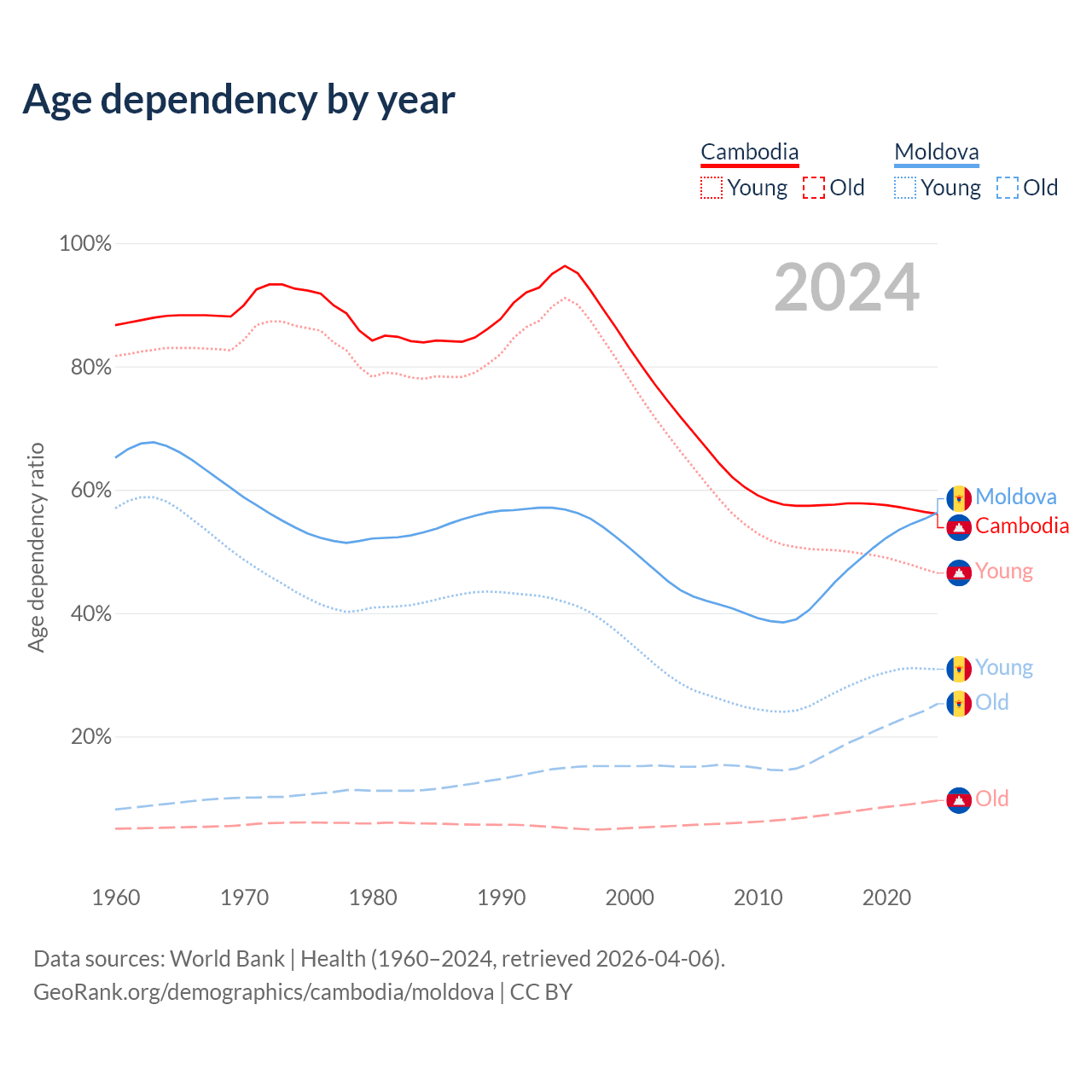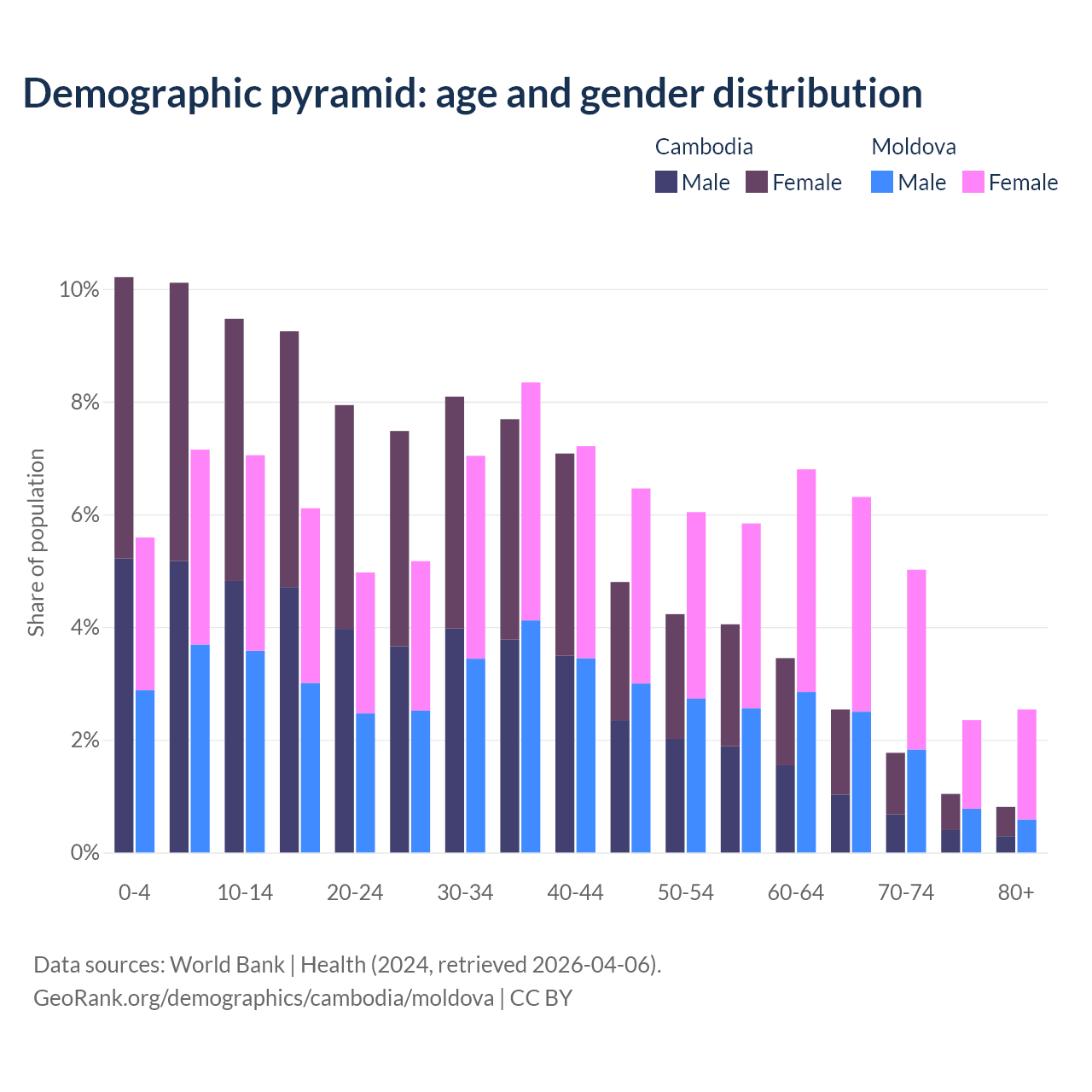 - Cambodia is ranked 121/196 by median age (oldest to youngest) vs 54/196 for Moldova.