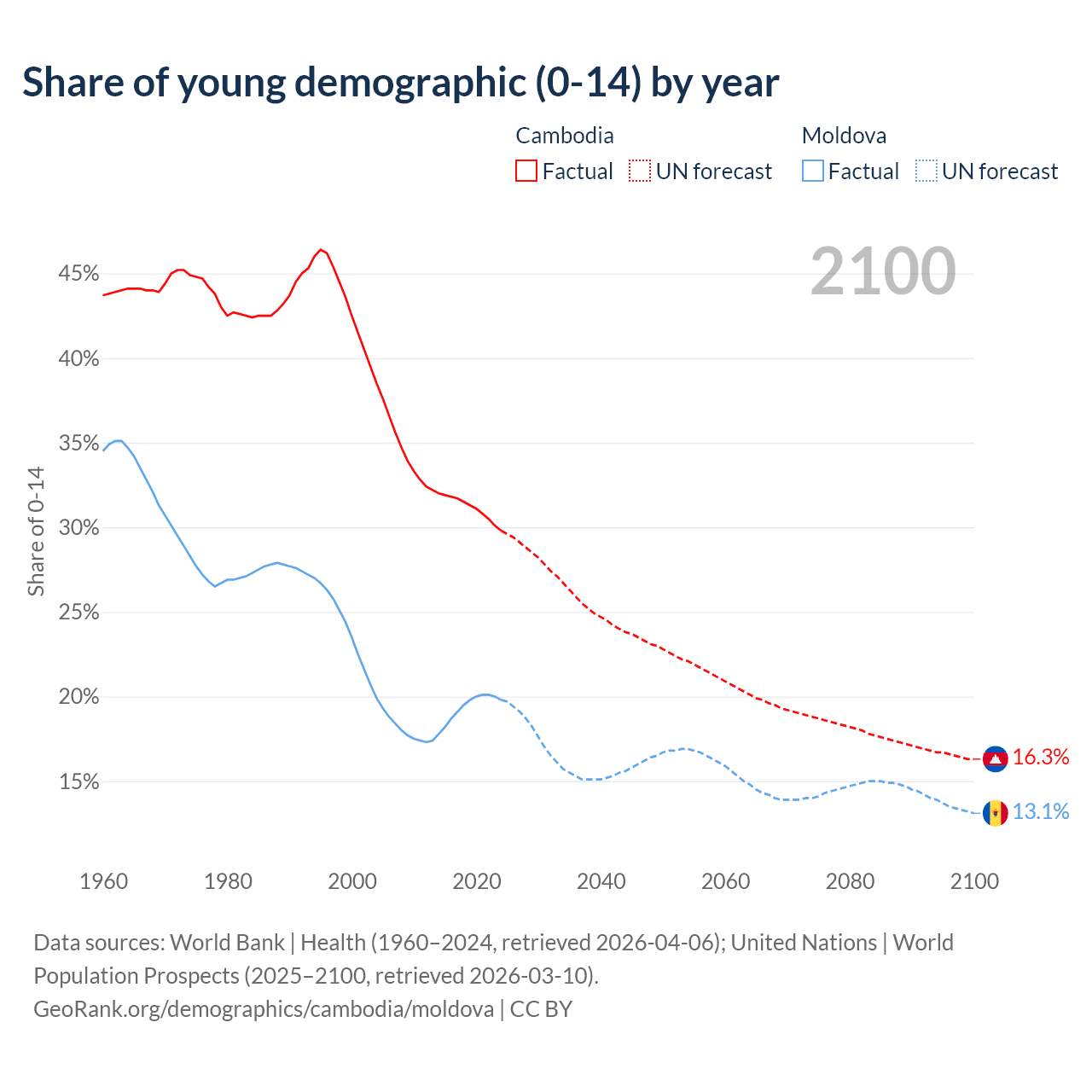- The share of young demographic (0-15 years old) in Cambodia is 29.8% vs 19.8% in Moldova.