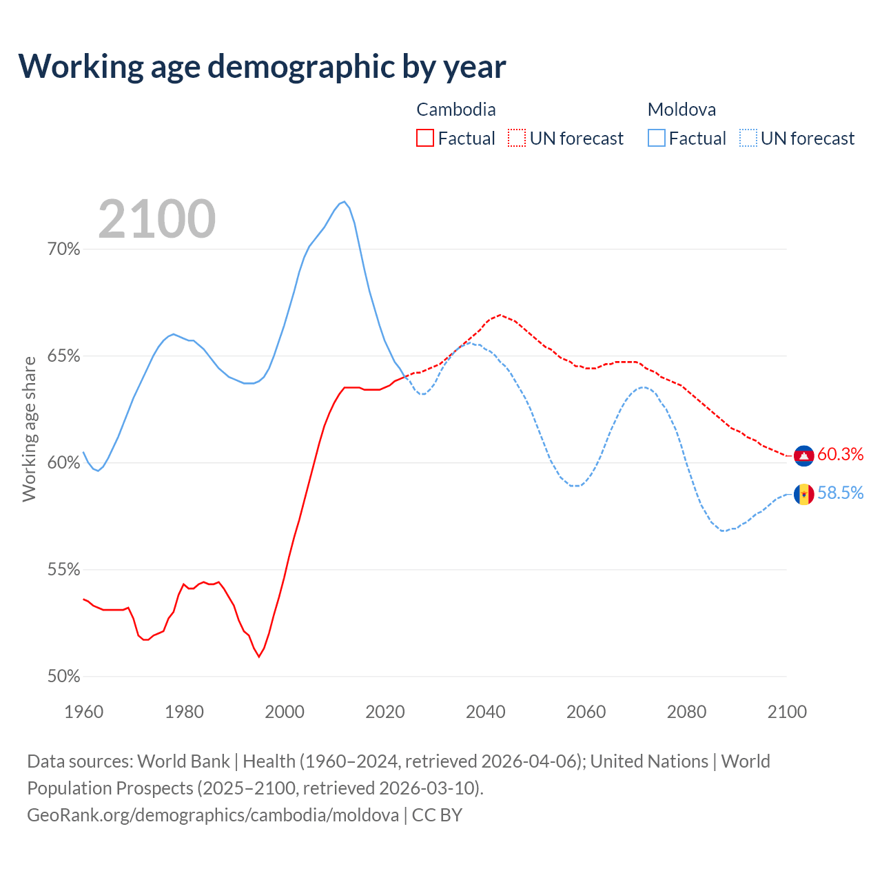 - Cambodia has 11.6M working age adults (aged 15-64) vs 1.5M in Moldova.