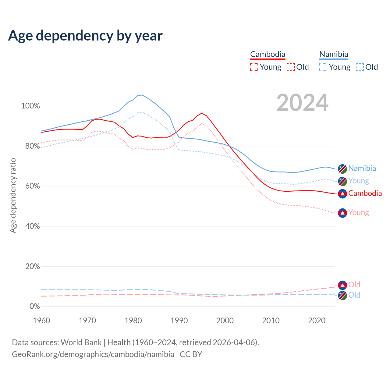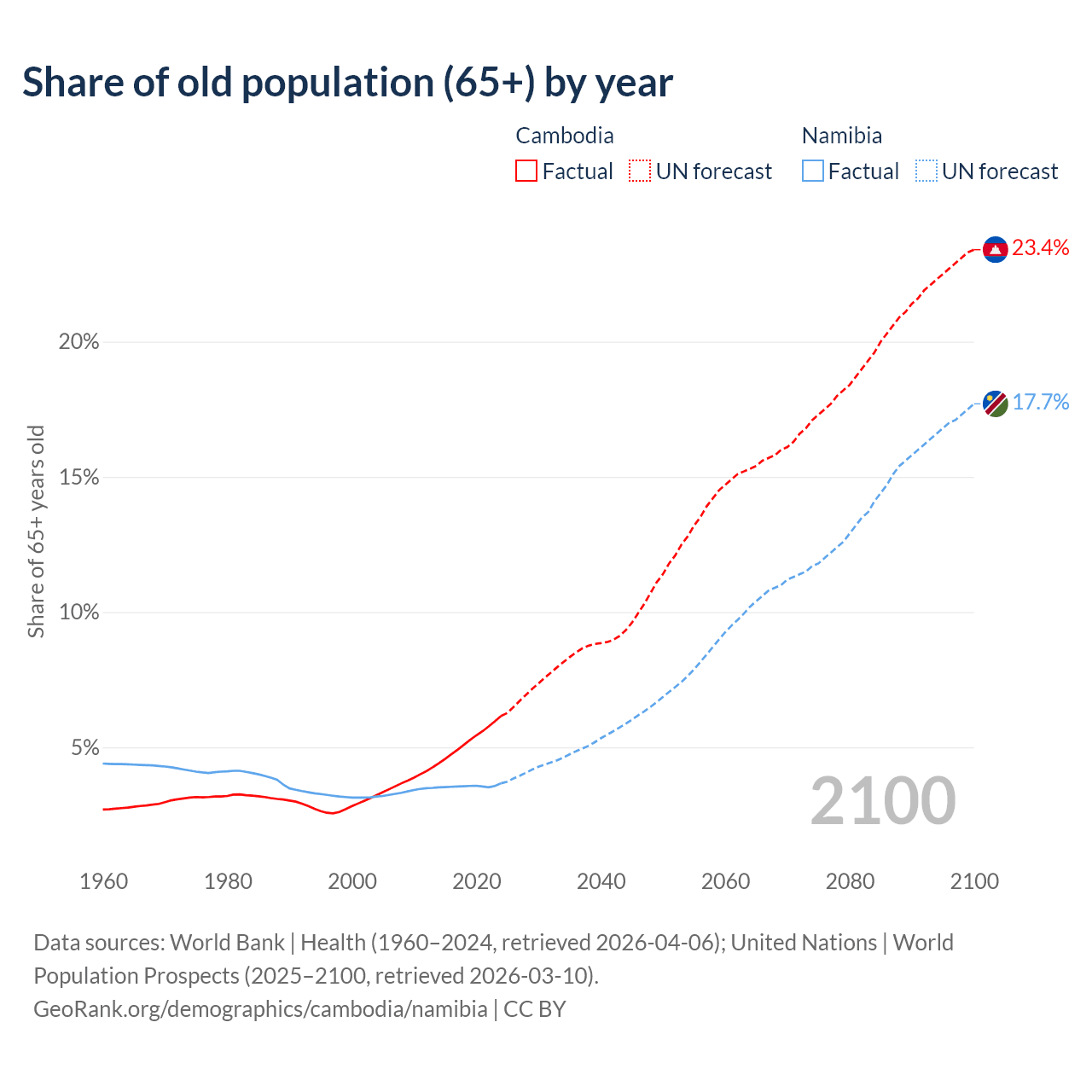 The share of older people aged 65 and over is 6.16% in Cambodia and 3.67% in Namibia. Life expectancy in Cambodia compared to Namibia .