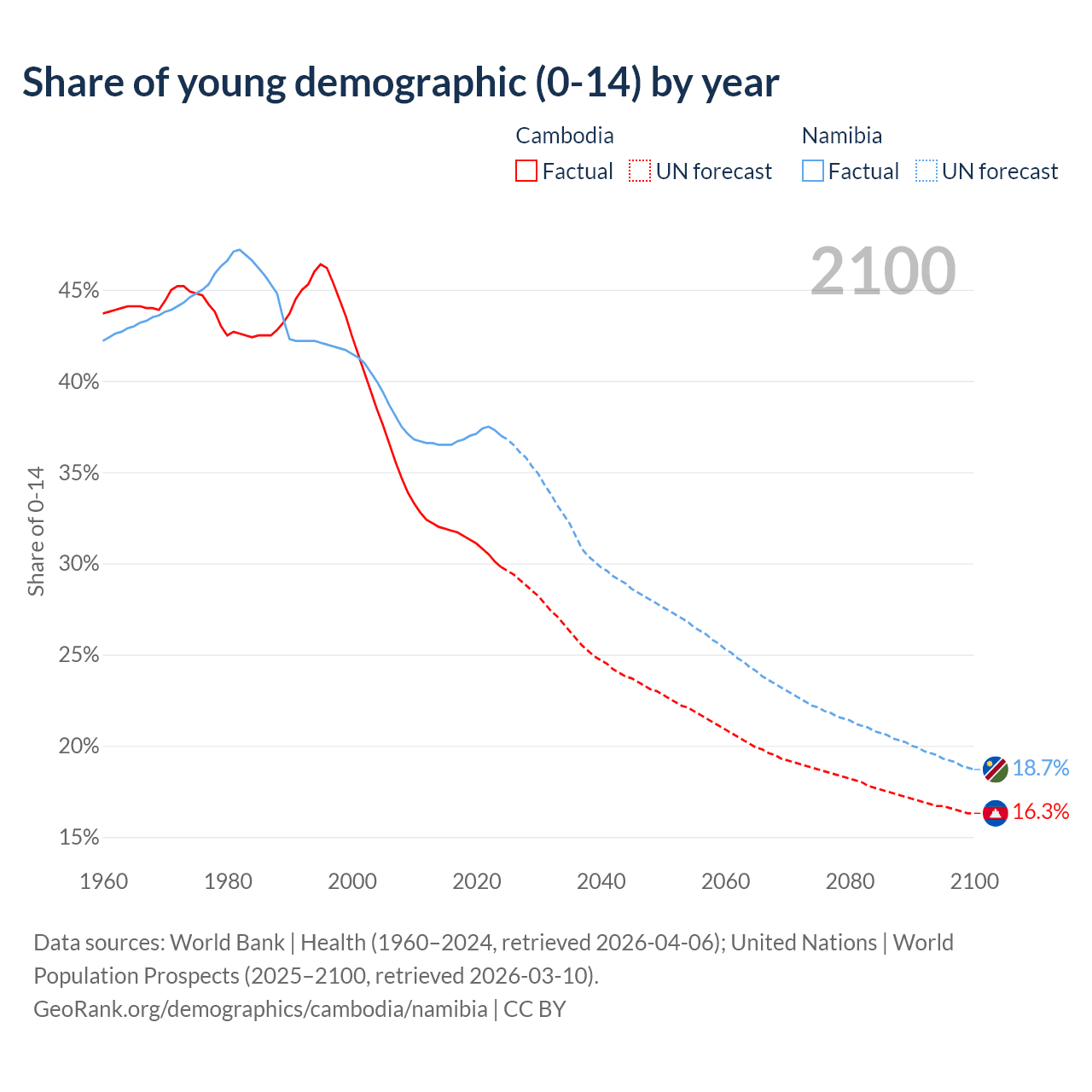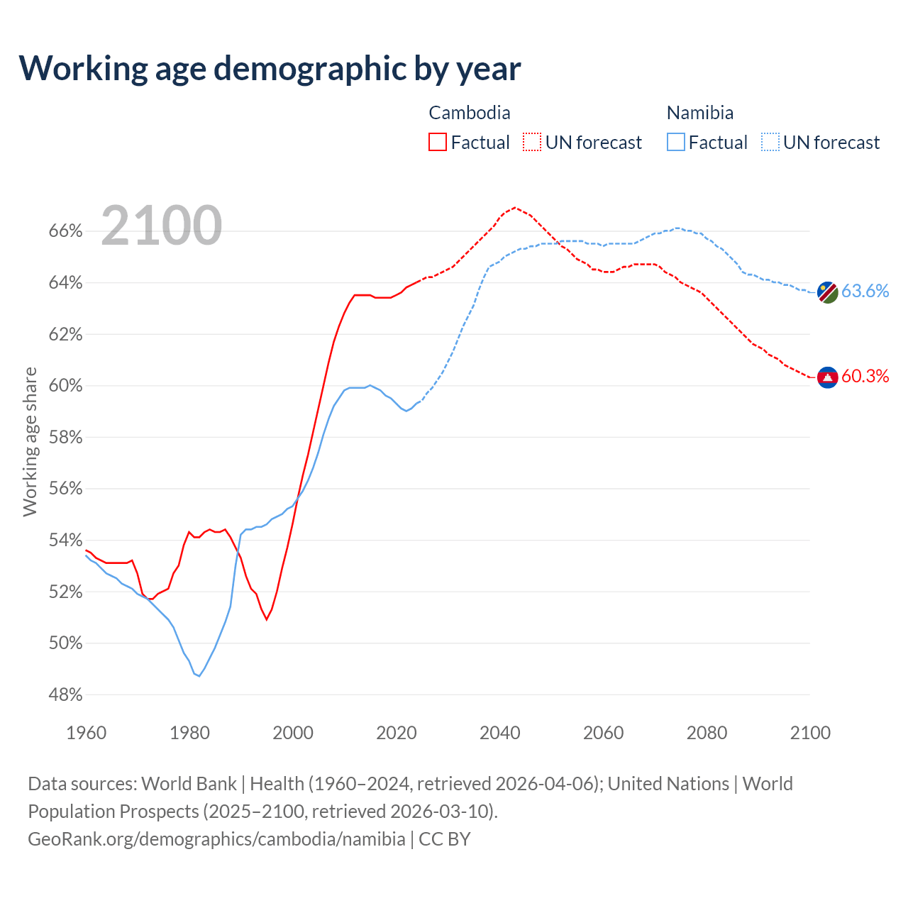 Median age Cambodia vs Namibia, 1960-2100