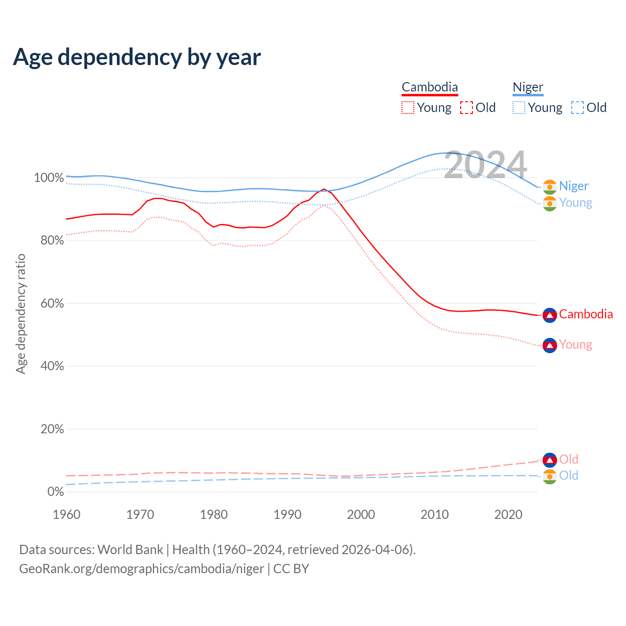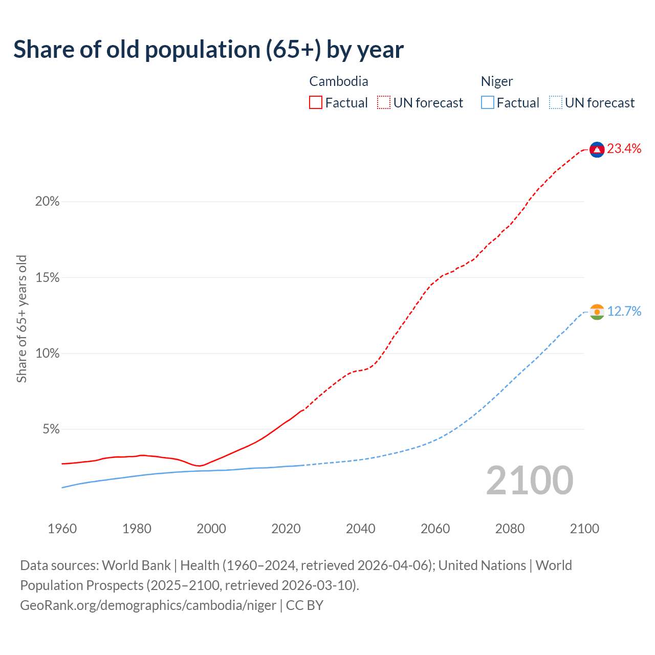 - The share of old-age demographic (65+) in Cambodia is 6.16% vs 2.59% in Niger.