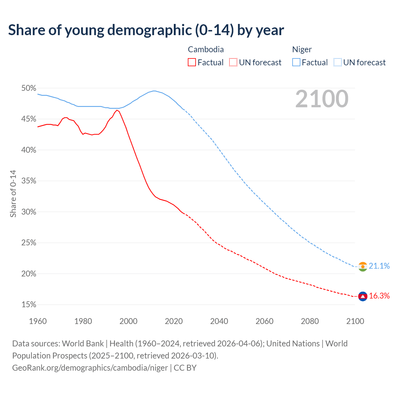 - The share of young demographic (0-15 years old) in Cambodia is 29.8% vs 46.6% in Niger.