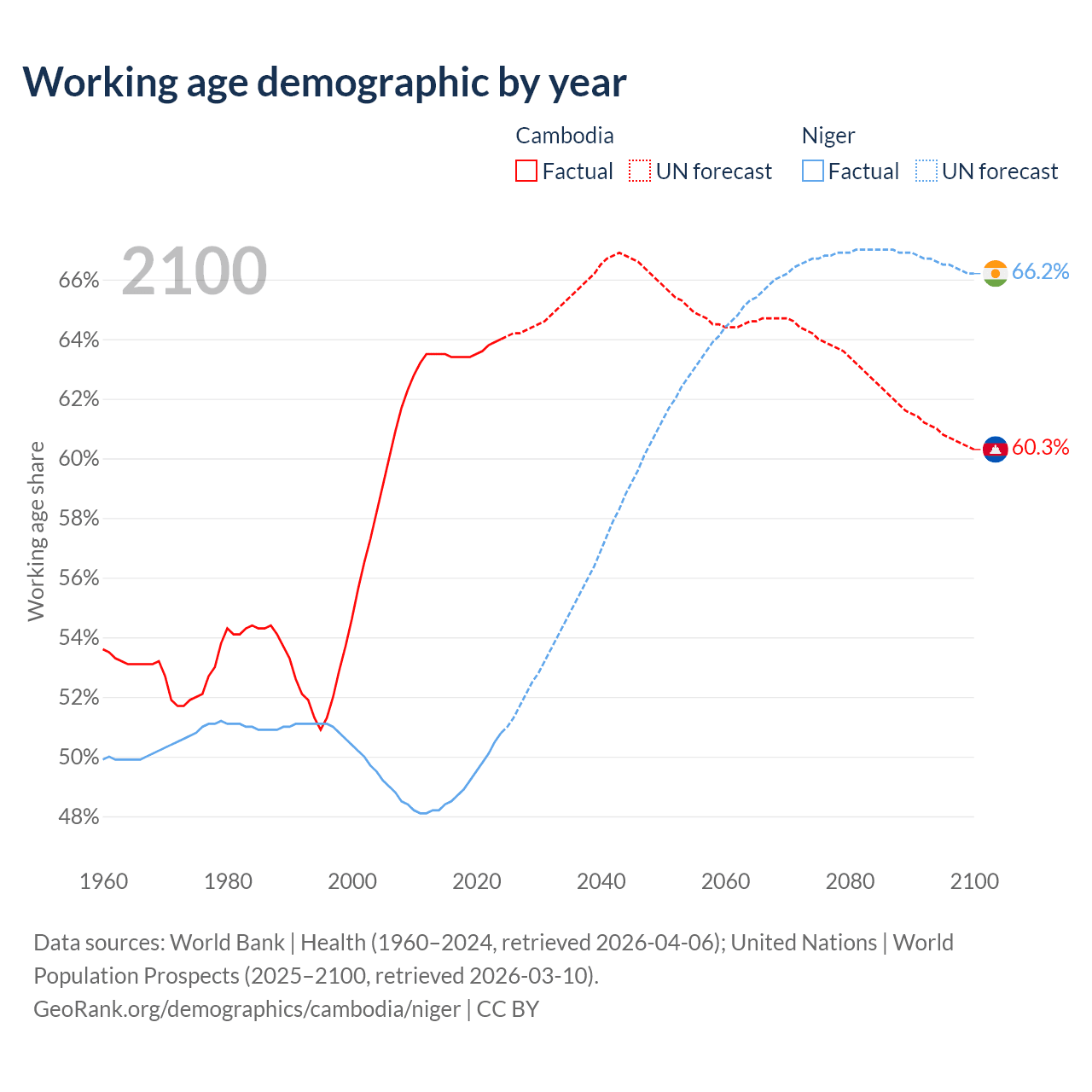 - Cambodia has 11.6M working age adults (aged 15-64) vs 14.8M in Niger.