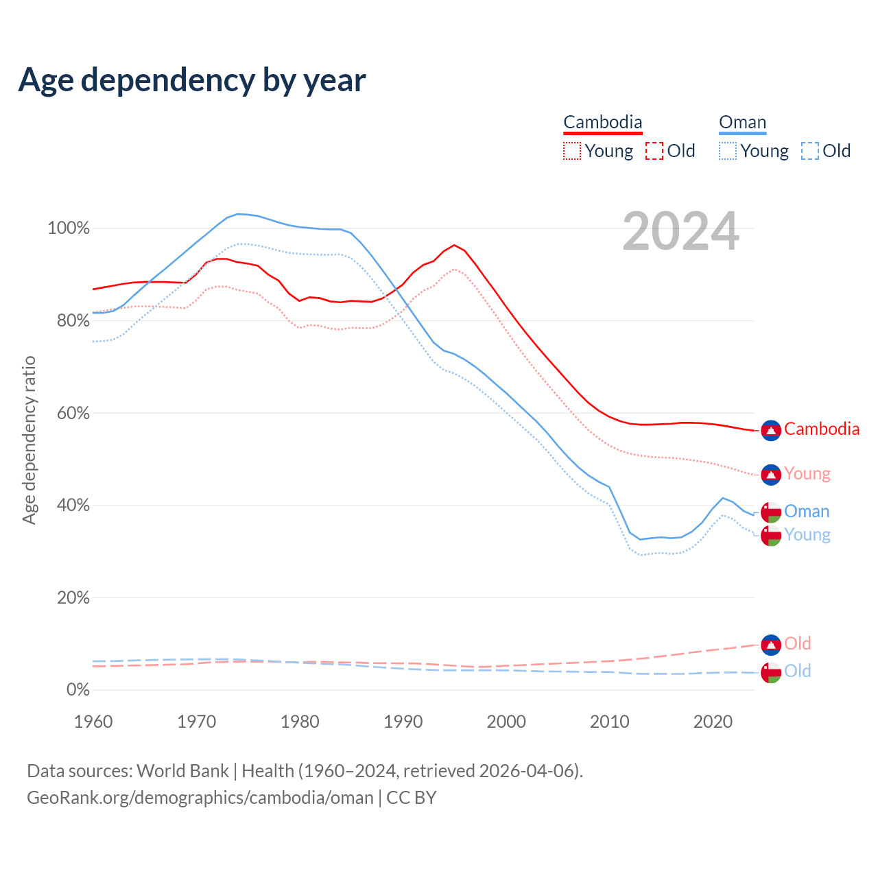 - Cambodia is ranked 121/196 by median age (oldest to youngest) vs 101/196 for Oman.