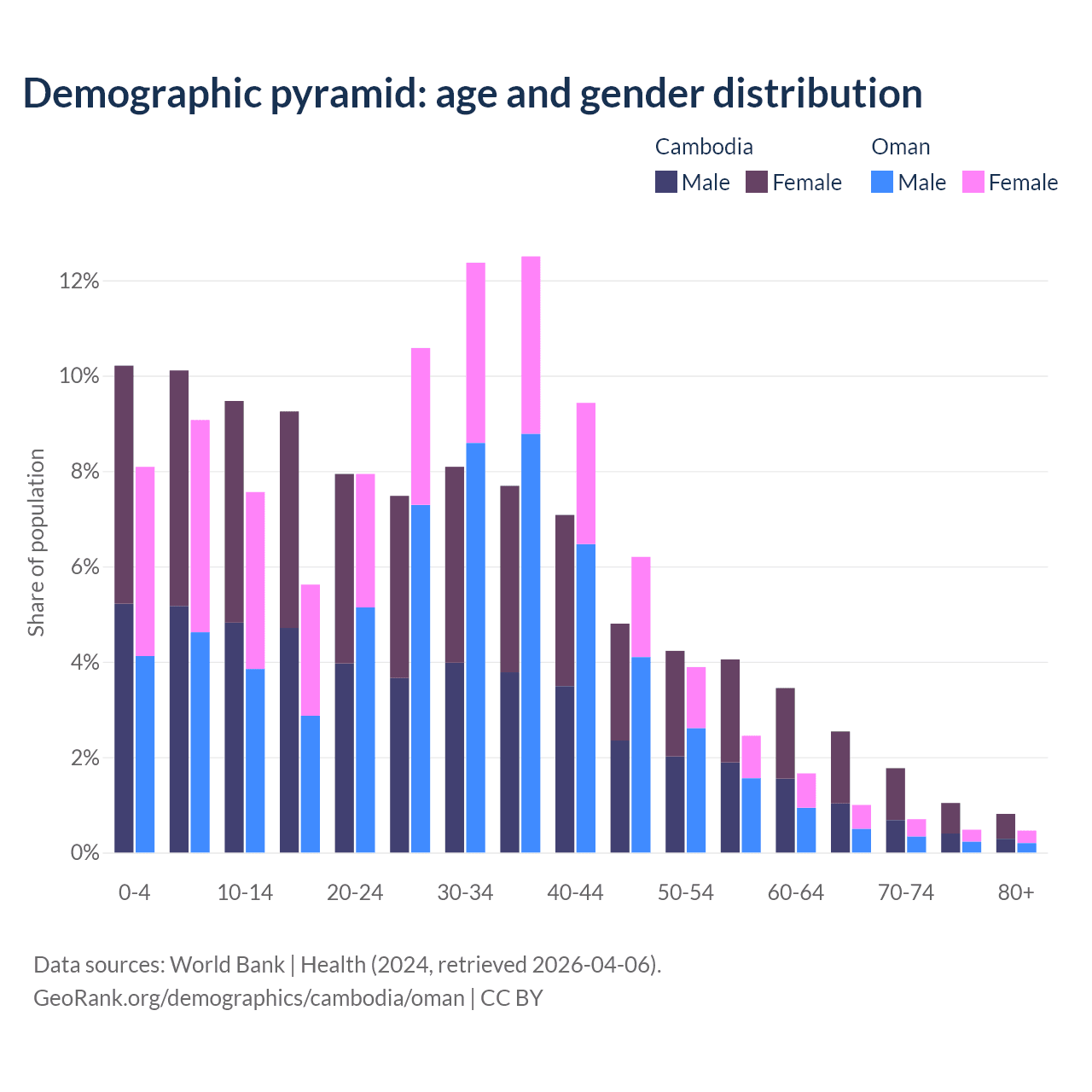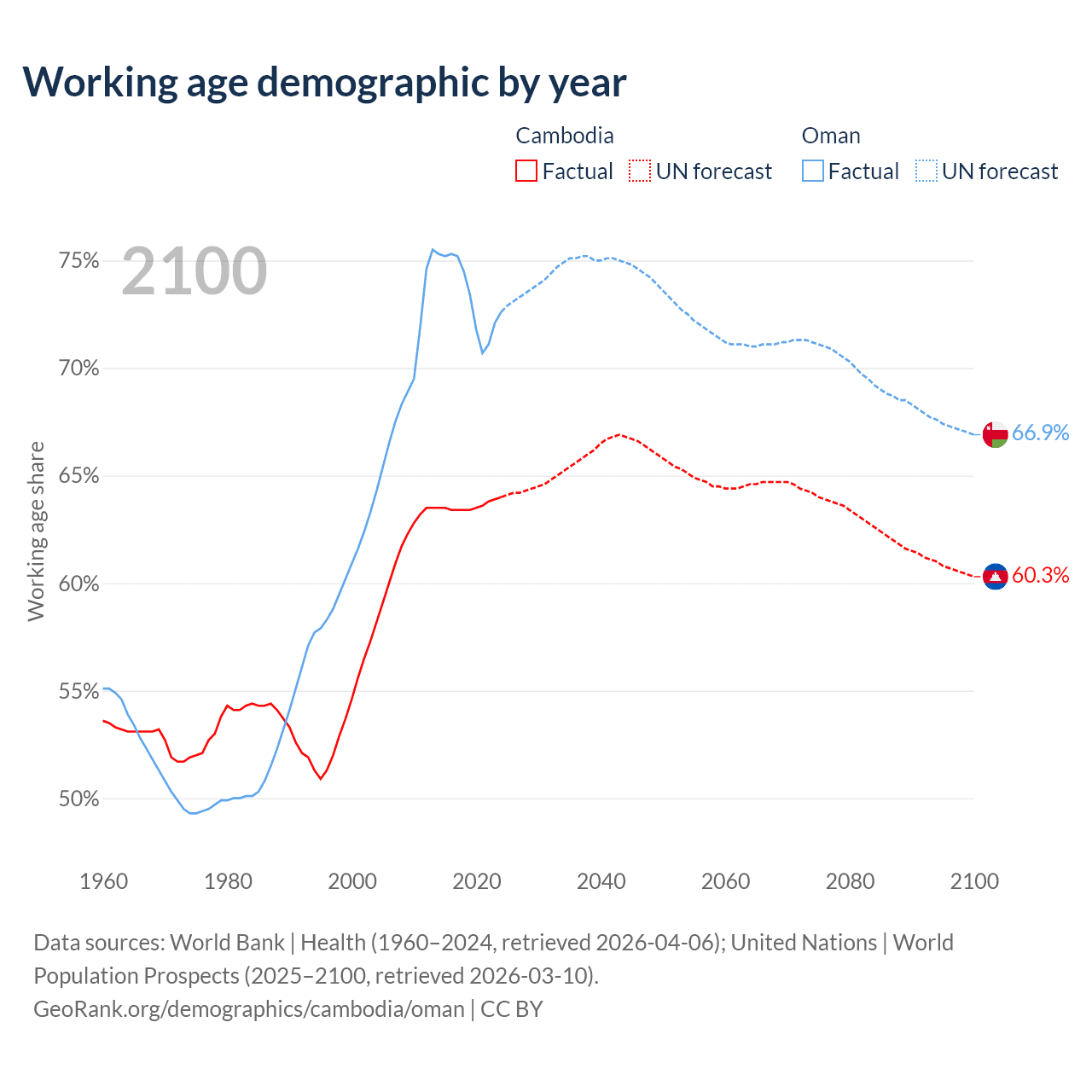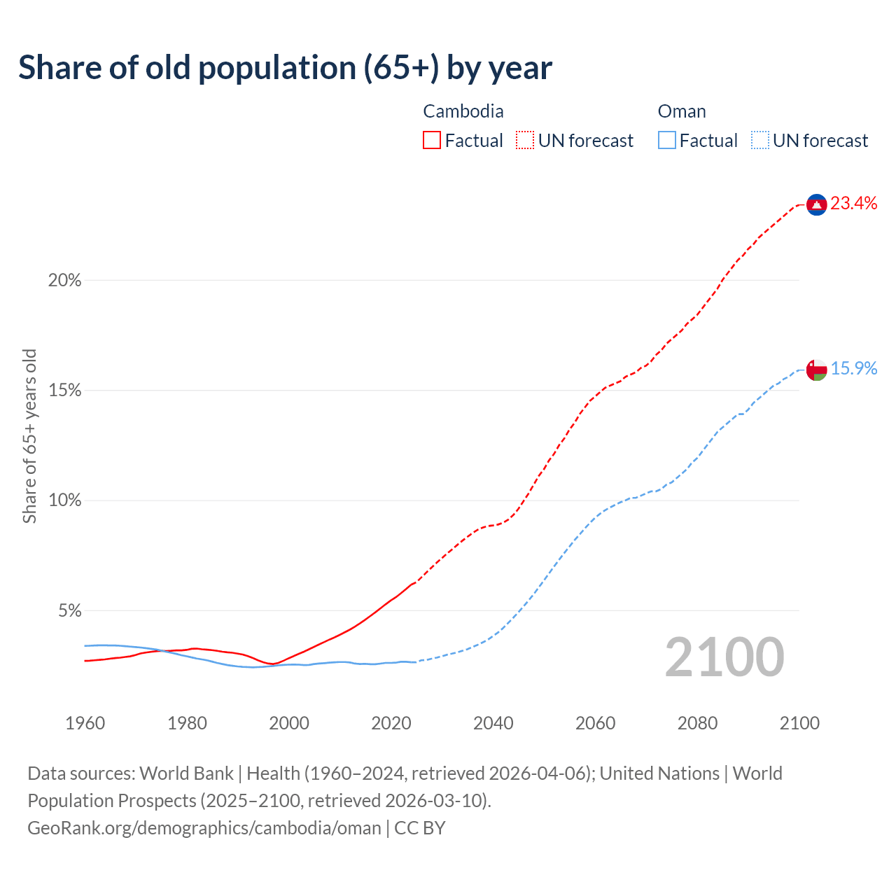 The share of older people aged 65 and over is 6.16% in Cambodia and 2.64% in Oman. Life expectancy in Cambodia compared to Oman .