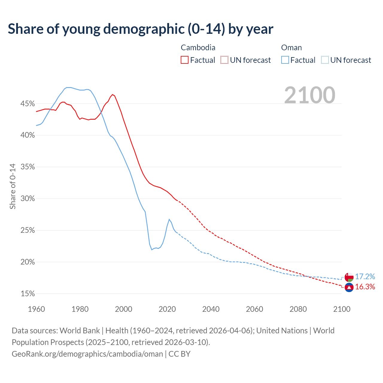 - The share of young demographic (0-15 years old) in Cambodia is 29.8% vs 24.7% in Oman.