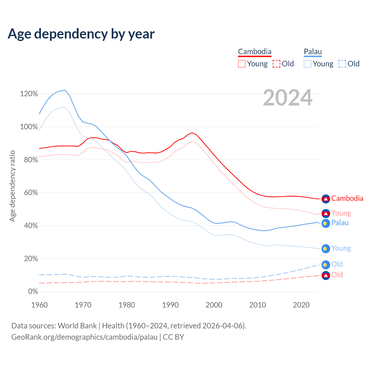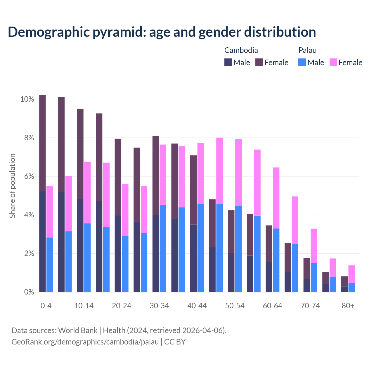 - The share of old-age demographic (65+) in Cambodia is 6.16% vs 11.3% in Palau.