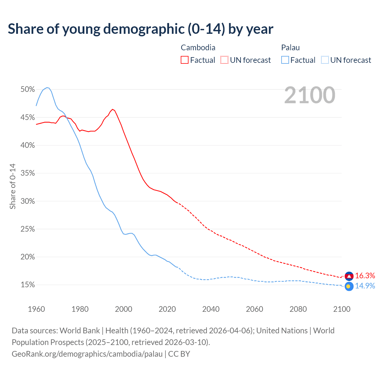 - The share of young demographic (0-15 years old) in Cambodia is 29.8% vs 18.2% in Palau.