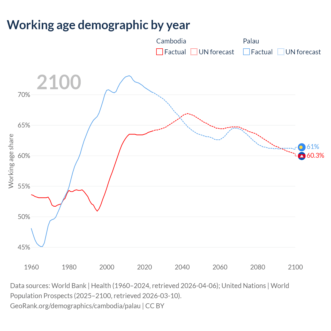The share of older people aged 65 and over is 6.16% in Cambodia and 11.3% in Palau. Life expectancy in Cambodia compared to Palau .