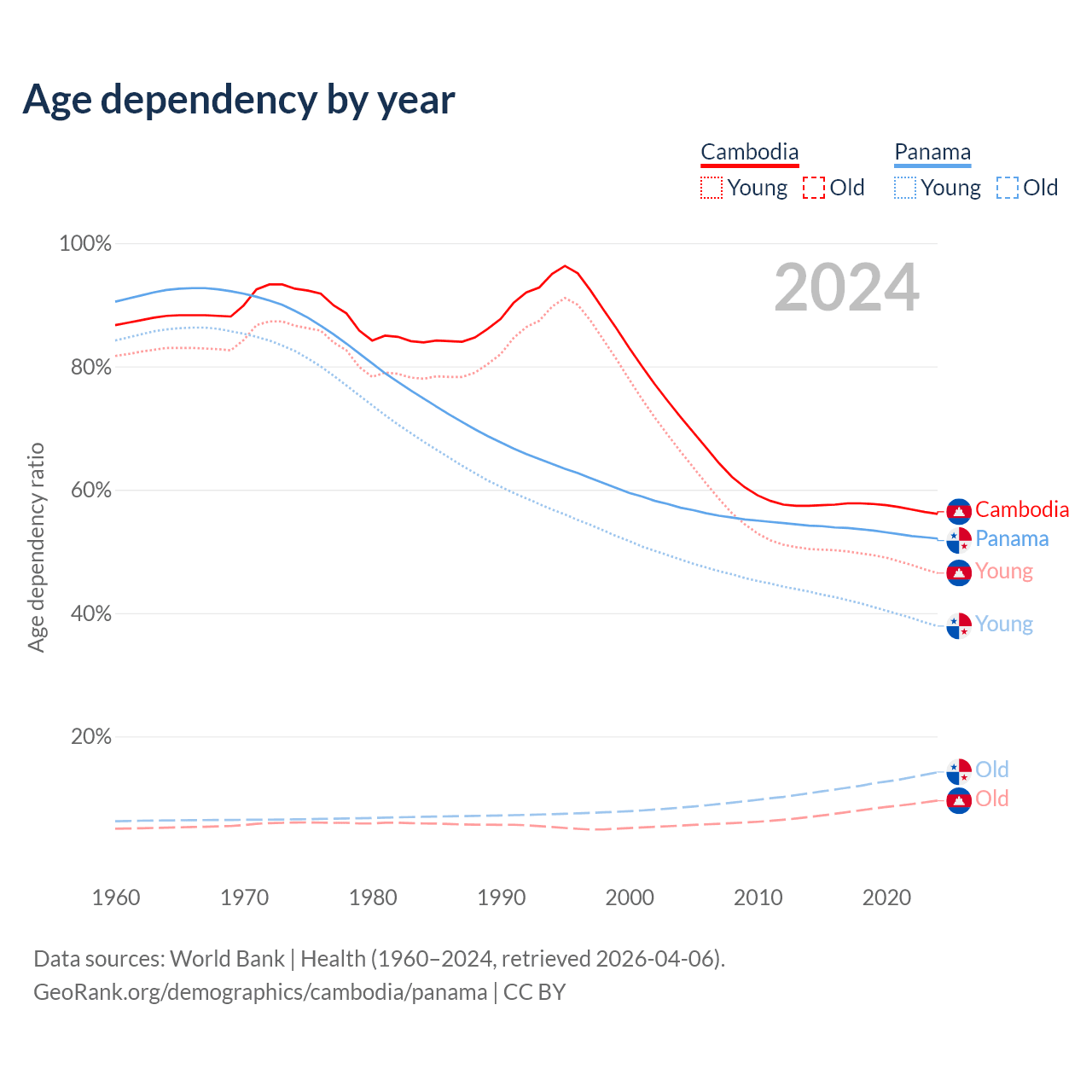 - Cambodia is ranked 121/196 by median age (oldest to youngest) vs 94/196 for Panama.